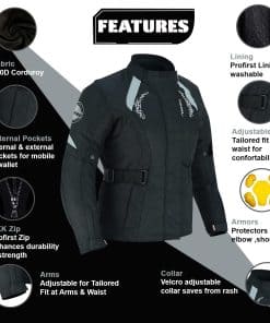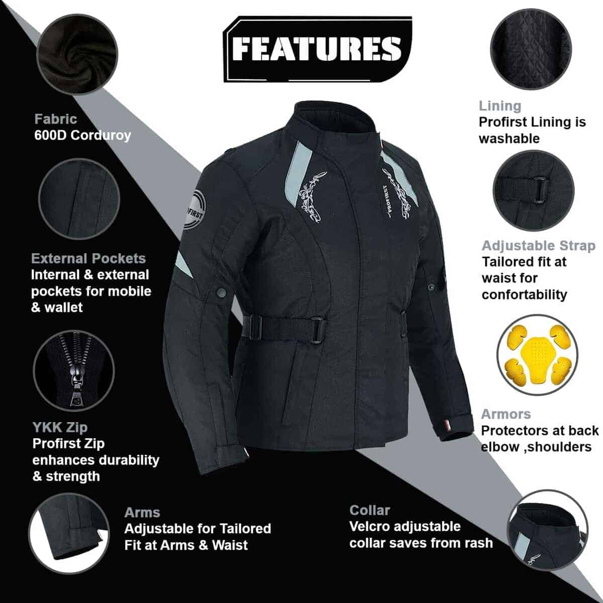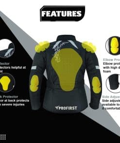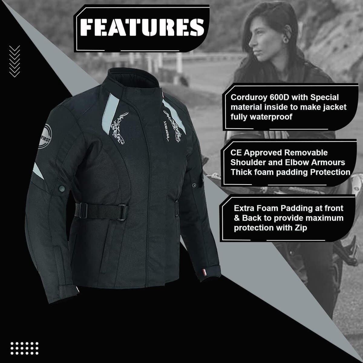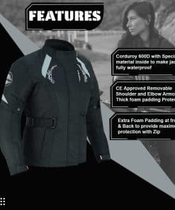 Chaqueta impermeable para mujer: Almohadilla de barbilla ajustable muy cómoda. Solapa de tormenta de longitud completa con VELCRO Paneles reflectantes de alta visibilidad en la parte delantera, trasera y brazos Armaduras CE aprobadas en codos, hombros y espalda Todas las armaduras son removibles Forro térmico desmontable y lavable a máquina Cinturón ajustable de tamaño Puños con fuelle integrado Cremallera de 8 pulgadas para conexión de pantalones Cuello acolchado cómodo Cremalleras extensibles en ambos lados del muslo Todas las costuras están selladas con moldería térmica para hacerla impermeable 2 bolsillos delanteros y 1 bolsillo interior y 1 bolsillo para móvil.
