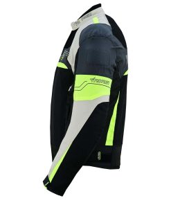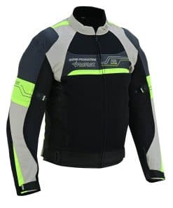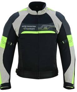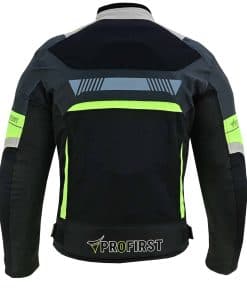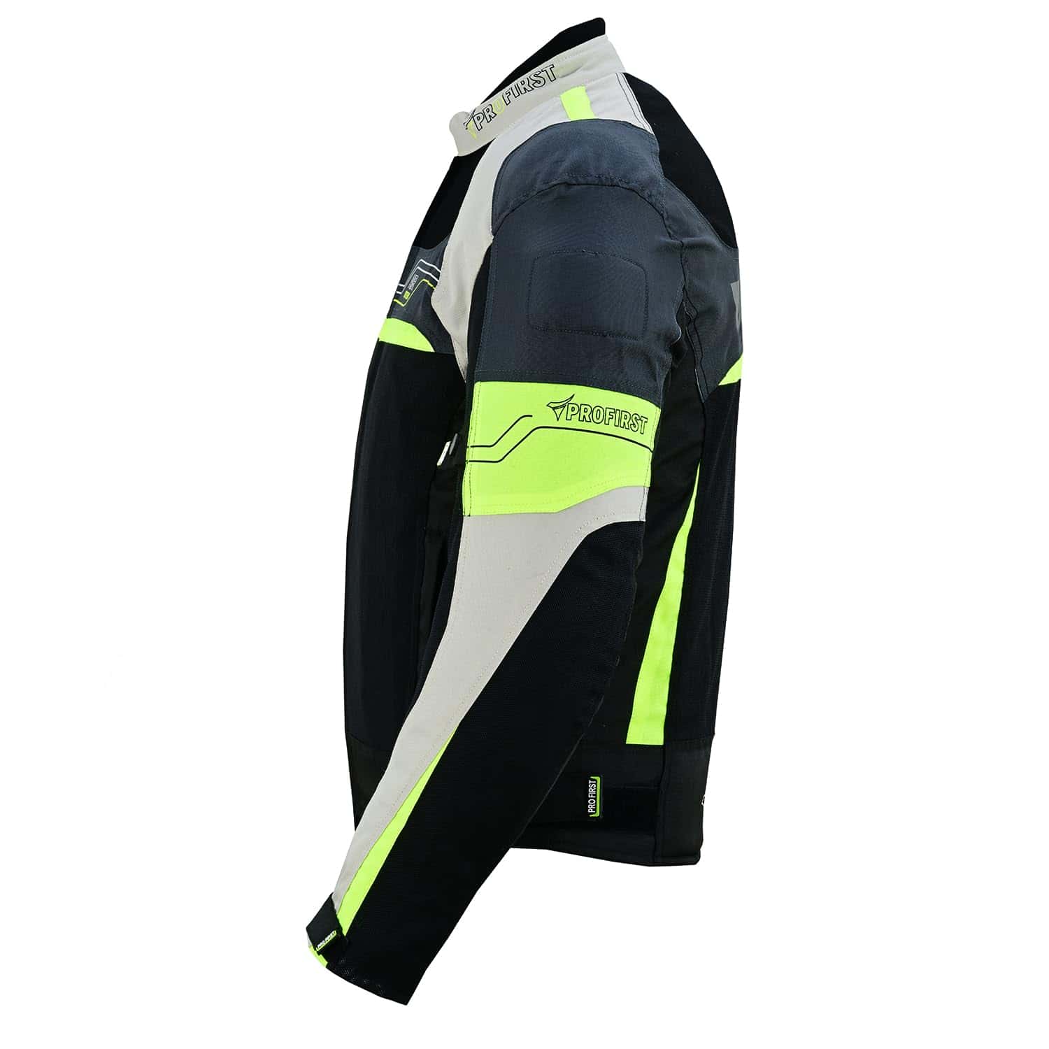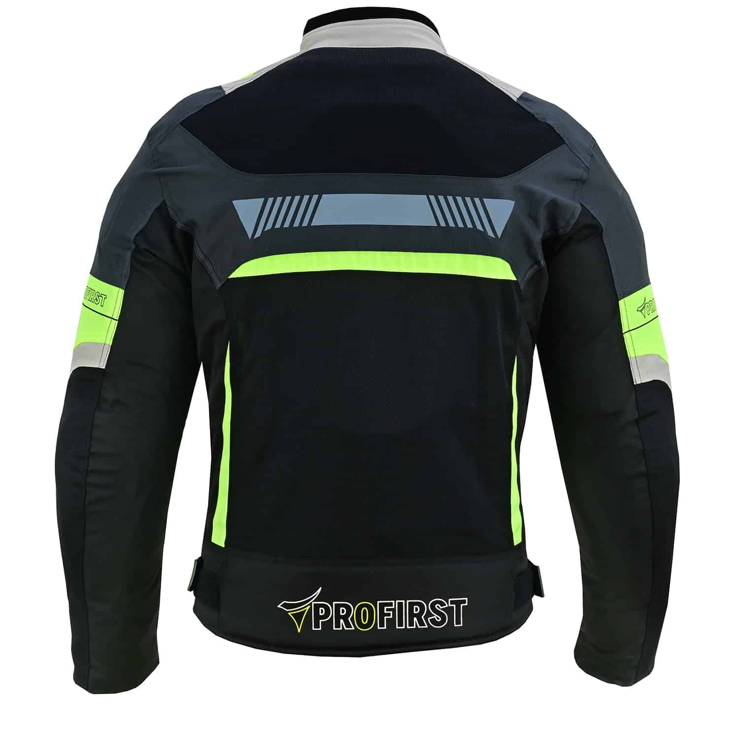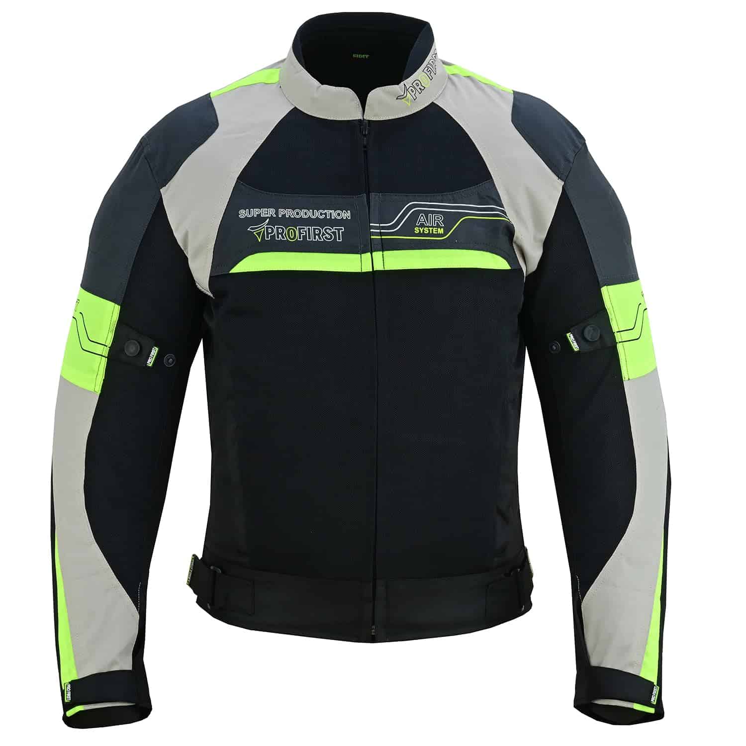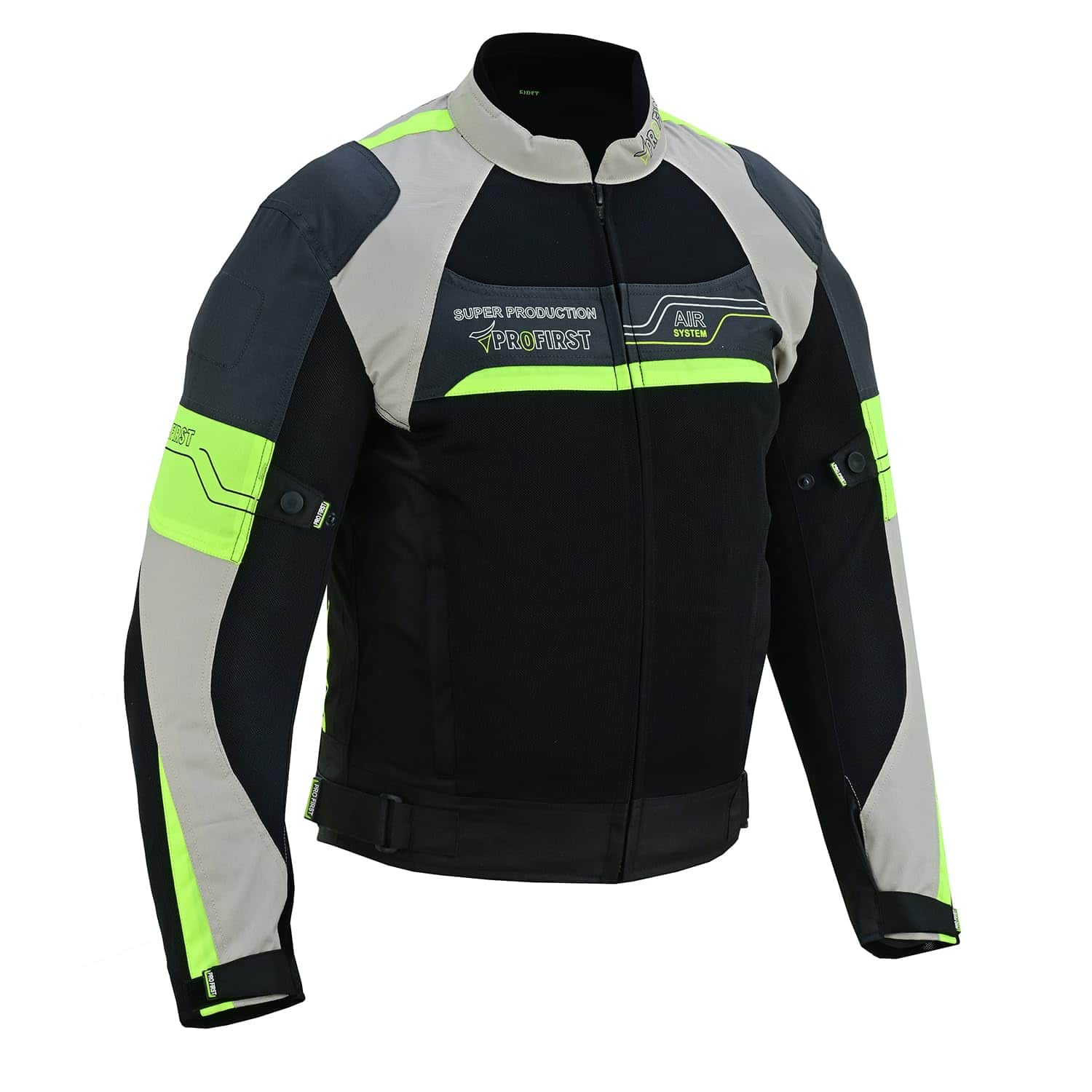 Chaqueta de moto de verano para hombre PROFIRST con protección acorazada CE aprobada y removible. El tejido de malla se utiliza en la parte delantera, trasera y brazos para mantener la circulación de aire en los días calurosos. Los bordes del cuello están hechos de tejido de neopreno, mientras que se utiliza un material de microfibra suave en el cuello para mayor comodidad. Las hombreras y coderas son aprobadas por CE y también son removibles. Los brazos son ajustables con botones originales de latón 80/50 para ajustes precisos. Cuenta con un cinturón de velcro para ajuste en la cintura y ajustes de puño. La chaqueta también cuenta con una cremallera de conexión a los pantalones para mayor seguridad.