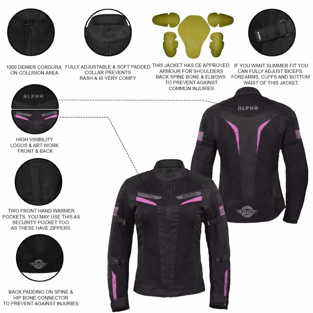 CHAQUETA DE MOTOCICLETA PARA MUJERES ALPHA CYCLE GEAR PROCEDENTE DE AÑOS DE TRABAJO DURO DE MOTOCICLISTAS EXPERIMENTADOS, CREANDO EQUIPOS DE ALTA CALIDAD CON PRECIOS EXCEPCIONALES, ACCESIBLES PARA TODOS LOS MOTOCICLISTAS, CON PROTECCIÓN DE ARMADURA CE.