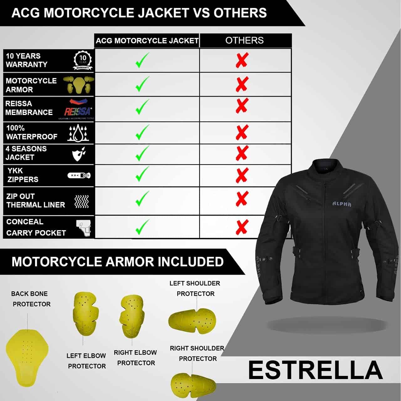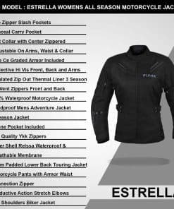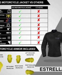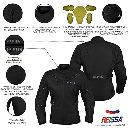 GARANTÍA DE 3 AÑOS. 5 ARMADURAS CE APROBADAS 2 HOMBROS, 2 CODOS, 1 ESPALDA – EXTRAÍBLES. CHAQUETA A PRUEBA DE AGUA PARA TODA TEMPORADA. TOTALMENTE AJUSTABLE EN 10 PUNTOS. OBTENGA EL AJUSTE PERSONALIZADO QUE DESEA FÁCILMENTE. FORRO INTERIOR TÉRMICO EXTRAÍBLE. SISTEMA DE FLUJO DE AIRE, 2 DELANTEROS, 3 TRASEROS. NO MÁS OLORES EN LAS AXILAS. LOGOS REFLEJADOS DE ALTA VISIBILIDAD EN FRENTE, ATRÁS Y BRAZOS. CUELLO DE ESPUMA DE MEMORIA PARA COMODIDAD. PROTECCIÓN SEMI 2 CAPAS DE GOMA ESPUMA EN LA ESPALDA. CONSTRUCCIÓN EXTERNA DE 1000 D TEJIDO DE CORDURA. CREMALLERA DE CONEXIÓN PARA PANTALONES DE MOTOCICLETA. BOLSILLO PARA TELÉFONO BOLSILLO PARA PORTA OCULTA BOLSILLO CALENTADOR DE MANO CREMALLERAS YKK.