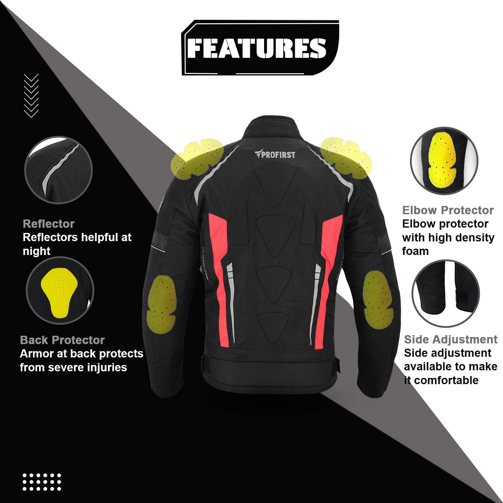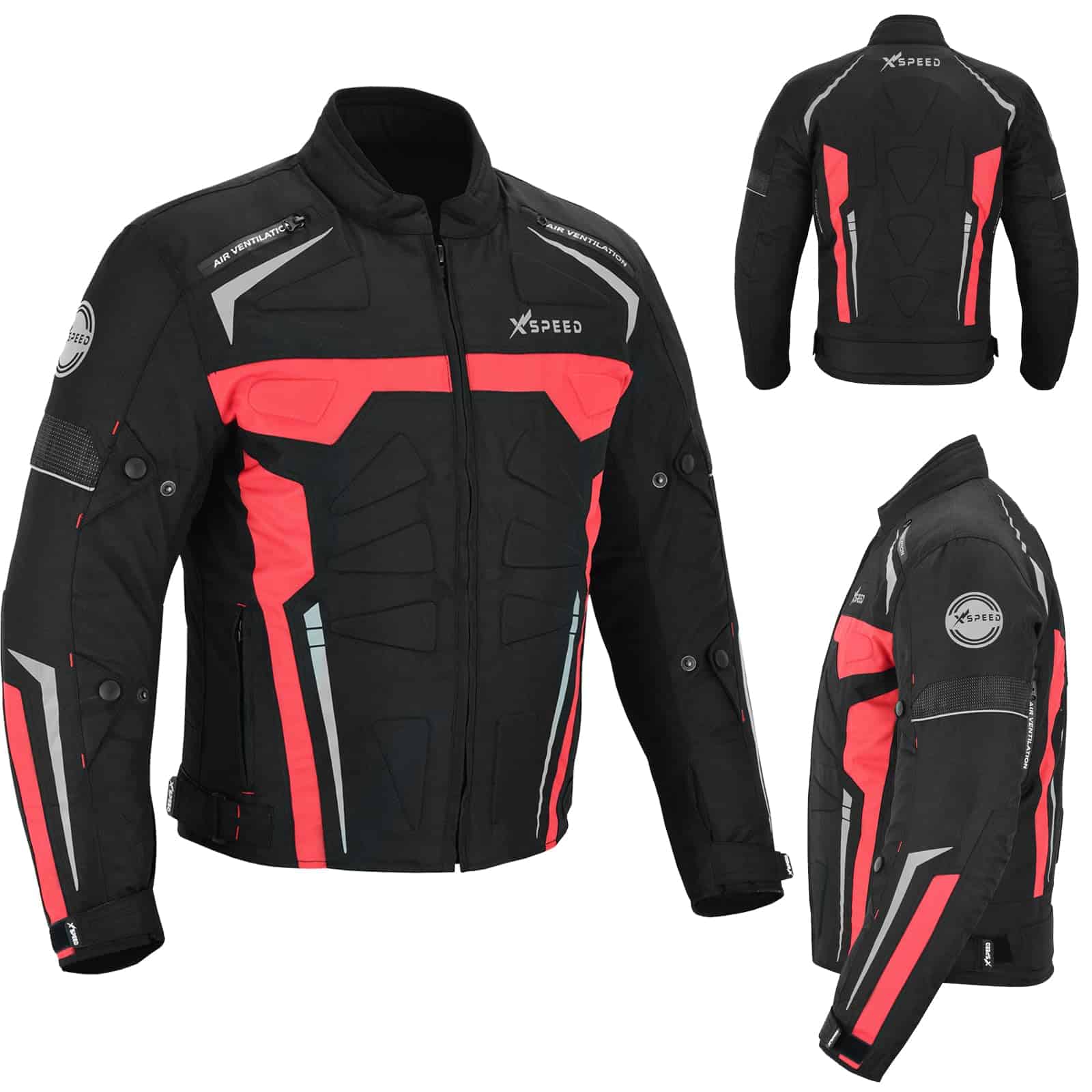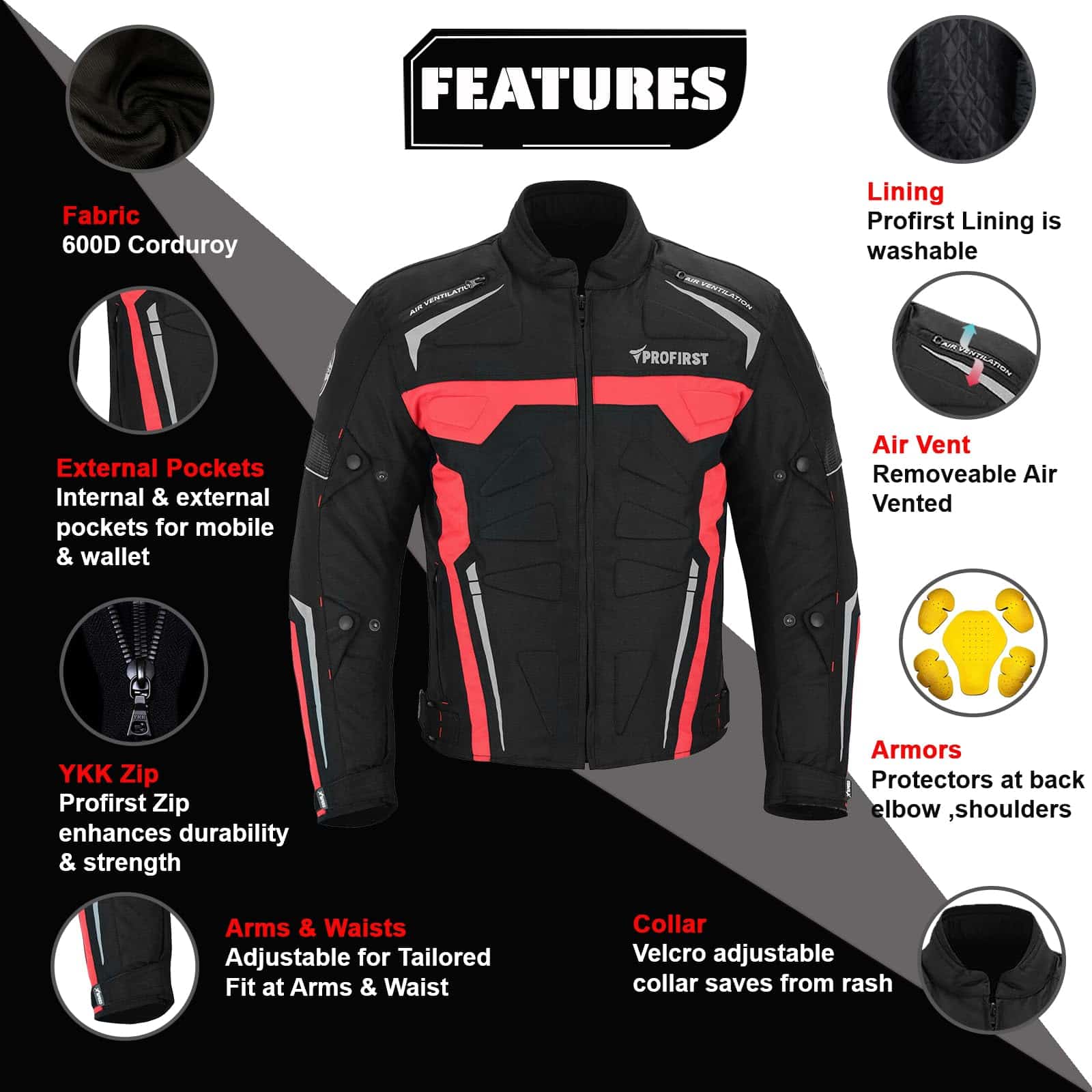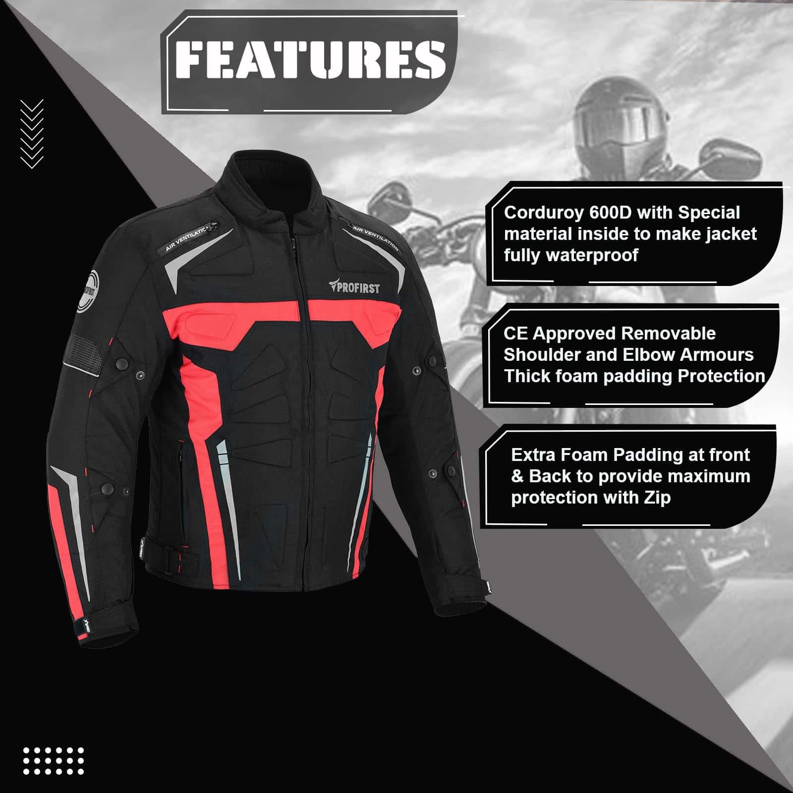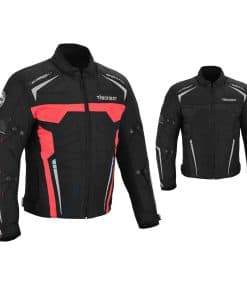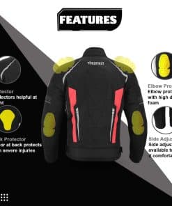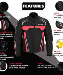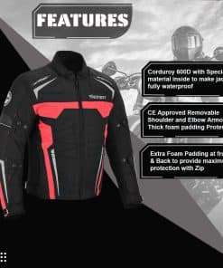 Chaqueta Impermeable de Motocicleta para Hombres en 600d Material de Cordura Protectores de Hombro y Codo Aprobados por CE Acolchado grueso de espuma Protección en la espalda Ajustes de puño y cintura con correa de cierre Cremallera Cierres de ventilación de aire en la parte delantera y trasera Forro – Removible y lavable. Para todo clima Cremallera completa YKK Bolsillo para móvil en el interior Acolchado adicional de espuma en la parte delantera y trasera para proporcionar máxima protección