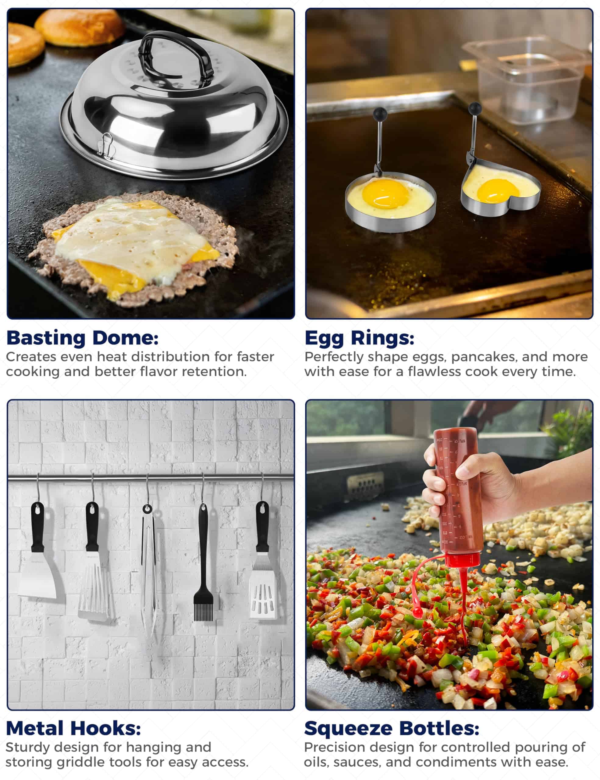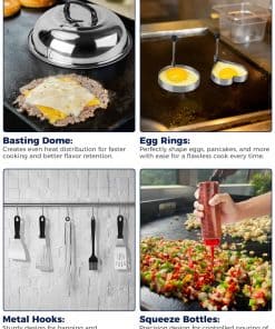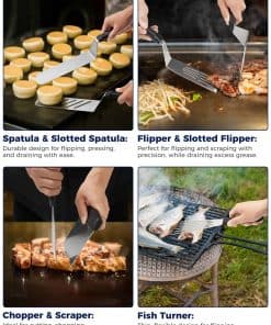 Lo último que quieres mientras cocinas en la parrilla es dejar caer tus costillas o bistec. Es por eso que tener herramientas antideslizantes es clave para un agarre seguro y fácil, y tenemos el completo set de 36 PCS para parrilla con todo lo que necesitas para cocinar una buena comida en una parrilla. El kit incluye ganchos que puedes instalar para colgar herramientas de forma conveniente, botellas para aceites y otros líquidos y aros para huevos, cubriendo cada comida del día.