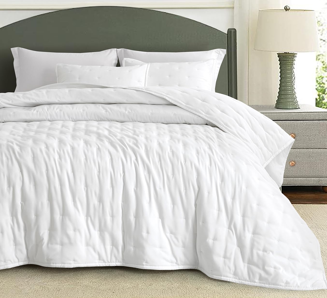 4. Versátil Comodidad para Todas las Estaciones: Ya sea una cálida noche de verano o una fría noche de invierno, la mezcla de Tencel y Modal y poliéster del edredón proporciona confort en cualquier temporada, adaptándose a las necesidades de su cuerpo. Su diseño atemporal hace que este edredón sea una adición versátil a cualquier decoración de dormitorio, complementando sin esfuerzo varios estilos y esquemas de color.