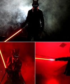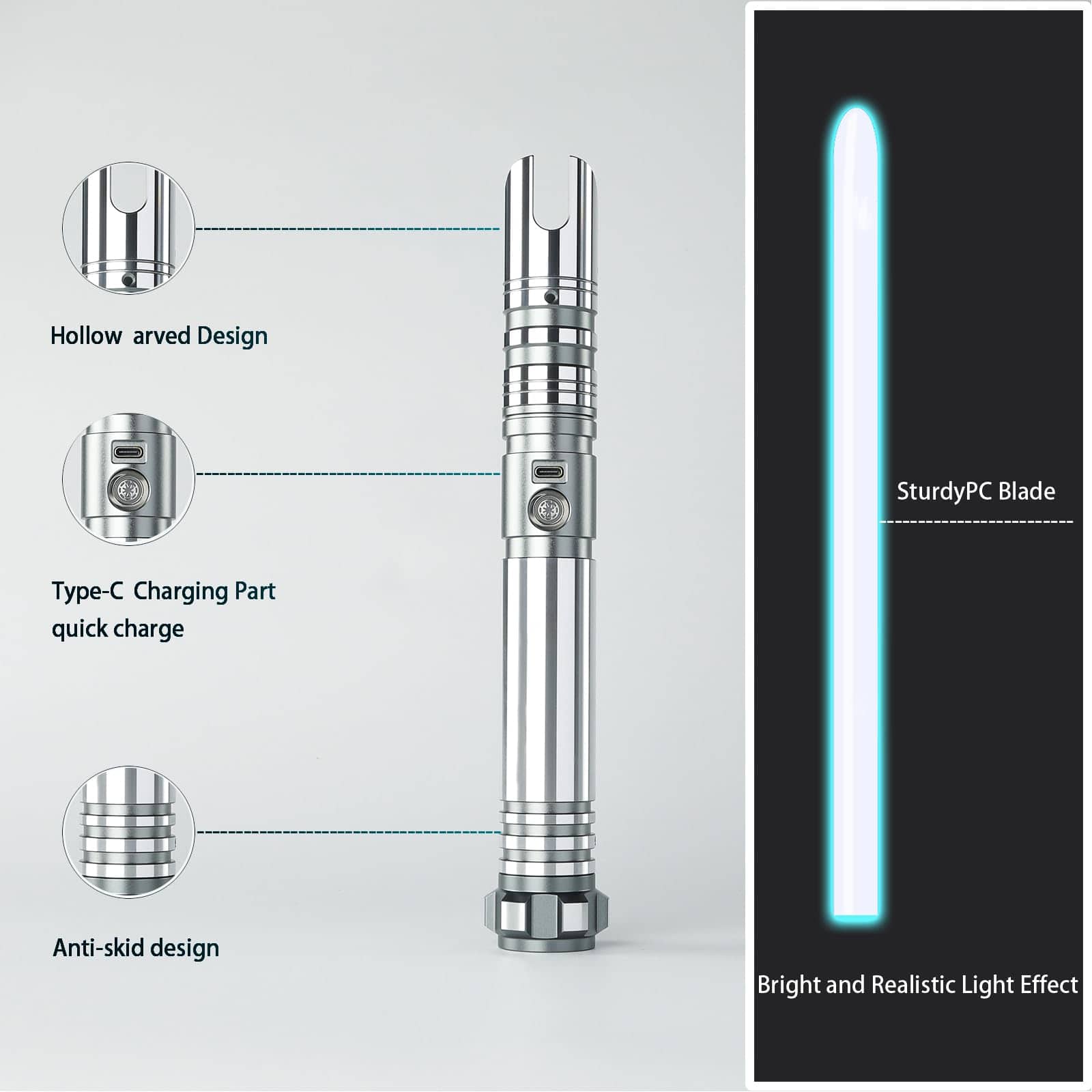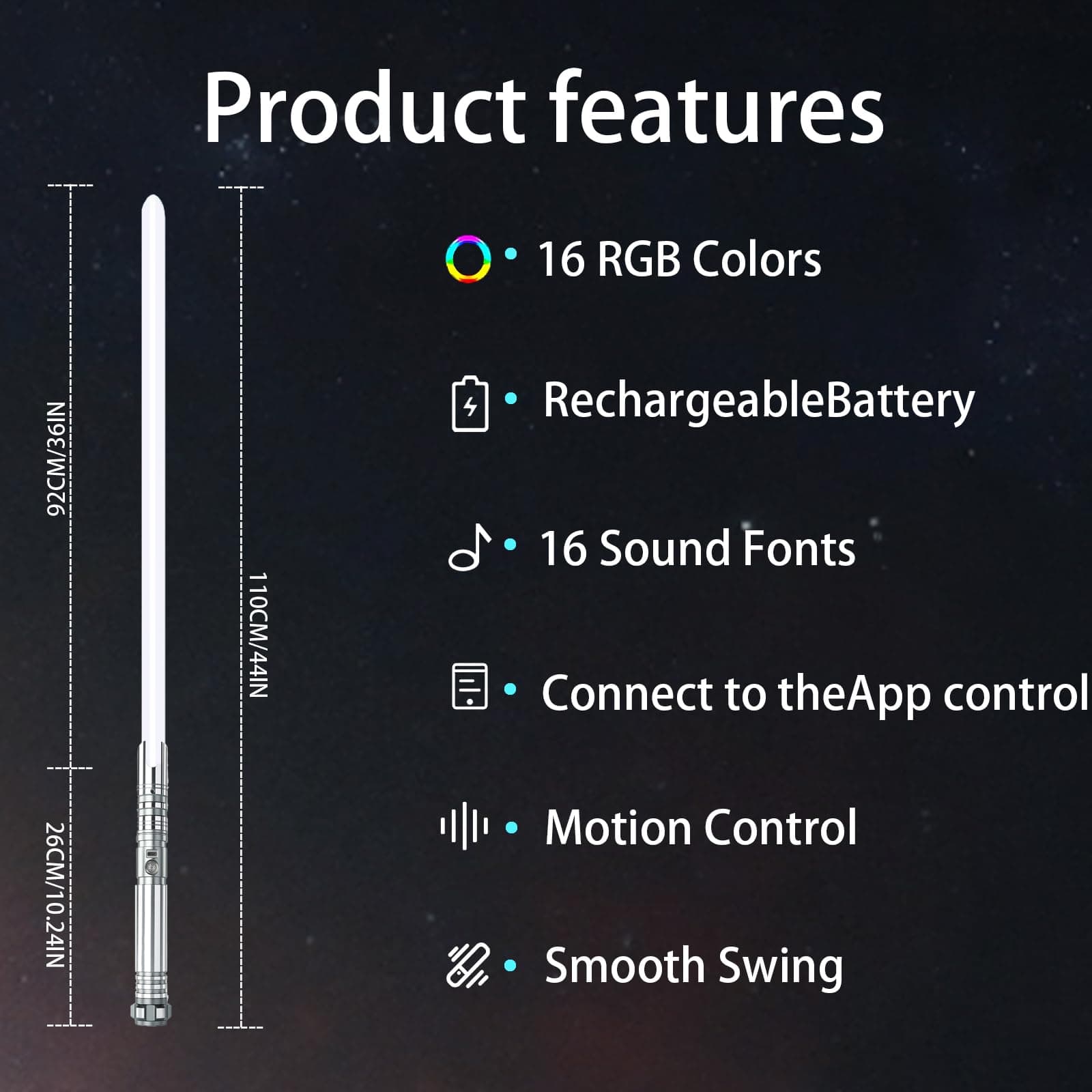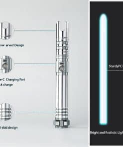 El sable de luz CHINEYDY presenta la última vibración de empuñadura mejorada, sonido de combate especial y modo de flash. El cómodo y antideslizante mango de espada está hecho de aluminio metálico, brindando una sensación más realista. La hoja PC resistente no es fácil de doblar ni doblar, resistente a los golpes, lo que te apoya para duelos reales pesados. La hoja está hecha de PC, no es fácil de deformar y es resistente a los golpes, soporta duelos pesados con luces. Control de APP – La APP RGB 3.0 soporta funciones como estado de la batería / visualización de tiempo, volumen, selección de interruptores de control de sonido / luz / color / movimiento, etc. La APP te permite ajustar libremente el volumen, fuente, efectos de iluminación, color, interruptores de control de movimiento y sensibilidad del sable de luz. Esta aplicación puede ajustarse rápidamente al estado que necesitas. Recargable y Batería de Gran Capacidad – Batería recargable de gran capacidad integrada de 3009 mAh, la batería es extraíble y reemplazable. Adecuado para fiestas de cosplay, deportes al aire libre, entretenimiento familiar, campamentos al aire libre, entrenamiento de deportes de esgrima, ideal para practicar duelos y juegos casuales.