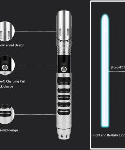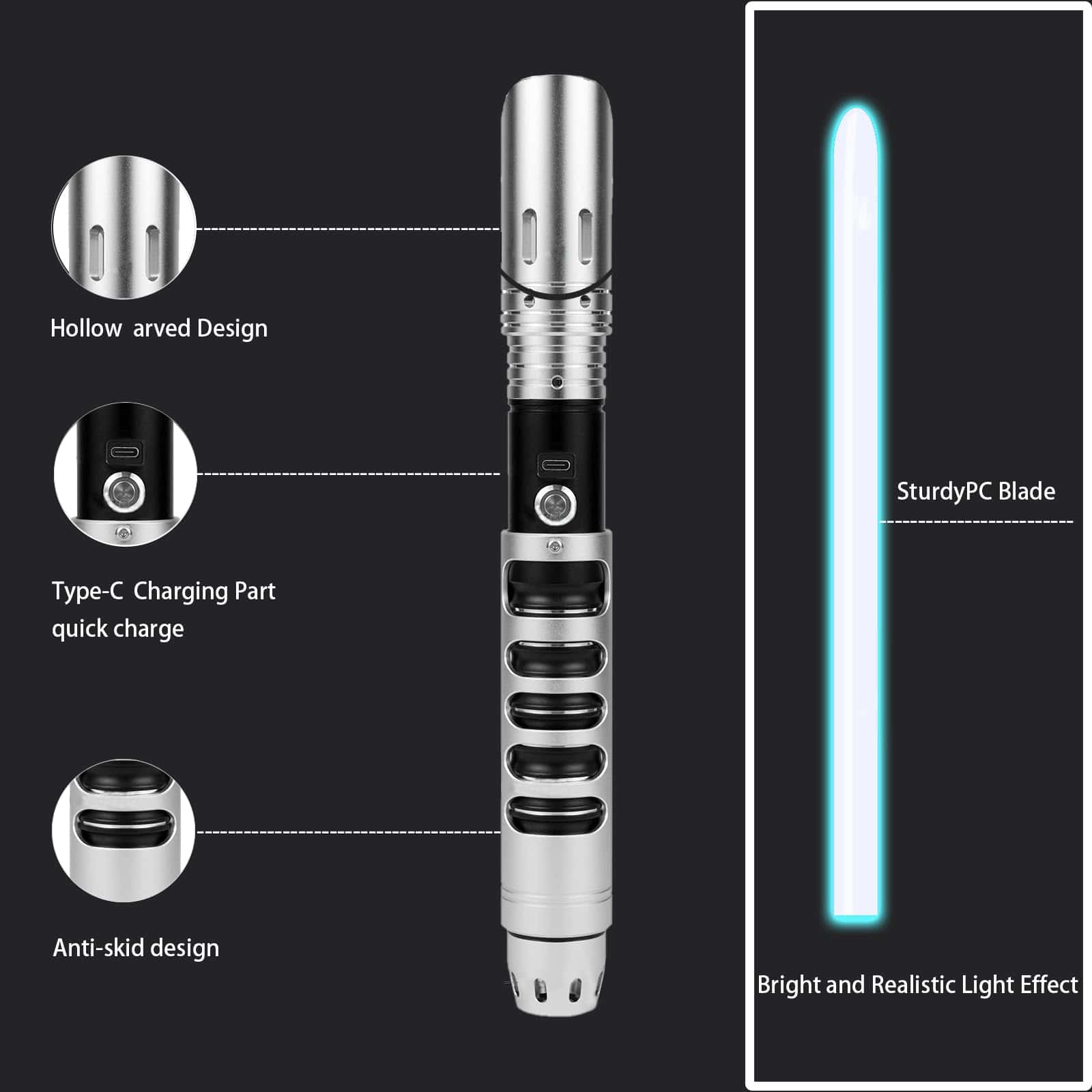1. Nuevo diseño de Sable de Luz: El sable de luz CHINEYDY se puede encender o apagar empujando, tirando, girando o balanceando la hoja. 16 juegos de fuentes de sonidos de personajes de películas y 16 colores que se pueden cambiar. Elija sonidos y colores favoritos para brindarle una experiencia realista.