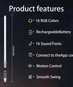 3. Efectos de Sonido y Movimiento Suave: 16 juegos de efectos de sonidos de fuentes configuraciones de estilo; 3 efectos de luz (Estable, Pulso, Inestable); 9 ajustes de volumen (Alto, Bajo, Silencio), que se pueden cambiar en cualquier momento, y el sonido se puede apagar. Movimiento suave y sensación de choque como un verdadero sable de luz.