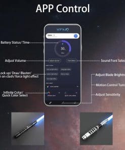 4. Control Gratis de la APP: La APP de RGB 3.0 admite funciones como estado de la batería/muestra de tiempo, volumen, 22 efectos de sonido/luz/color/selección de interruptores de control de movimiento, etc. La APP te permite ajustar libremente el volumen, fuente, efectos de iluminación, color, interruptores de control de movimiento y sensibilidad del sable de luz. Esta aplicación puede ajustarse rápidamente al estado que necesitas.