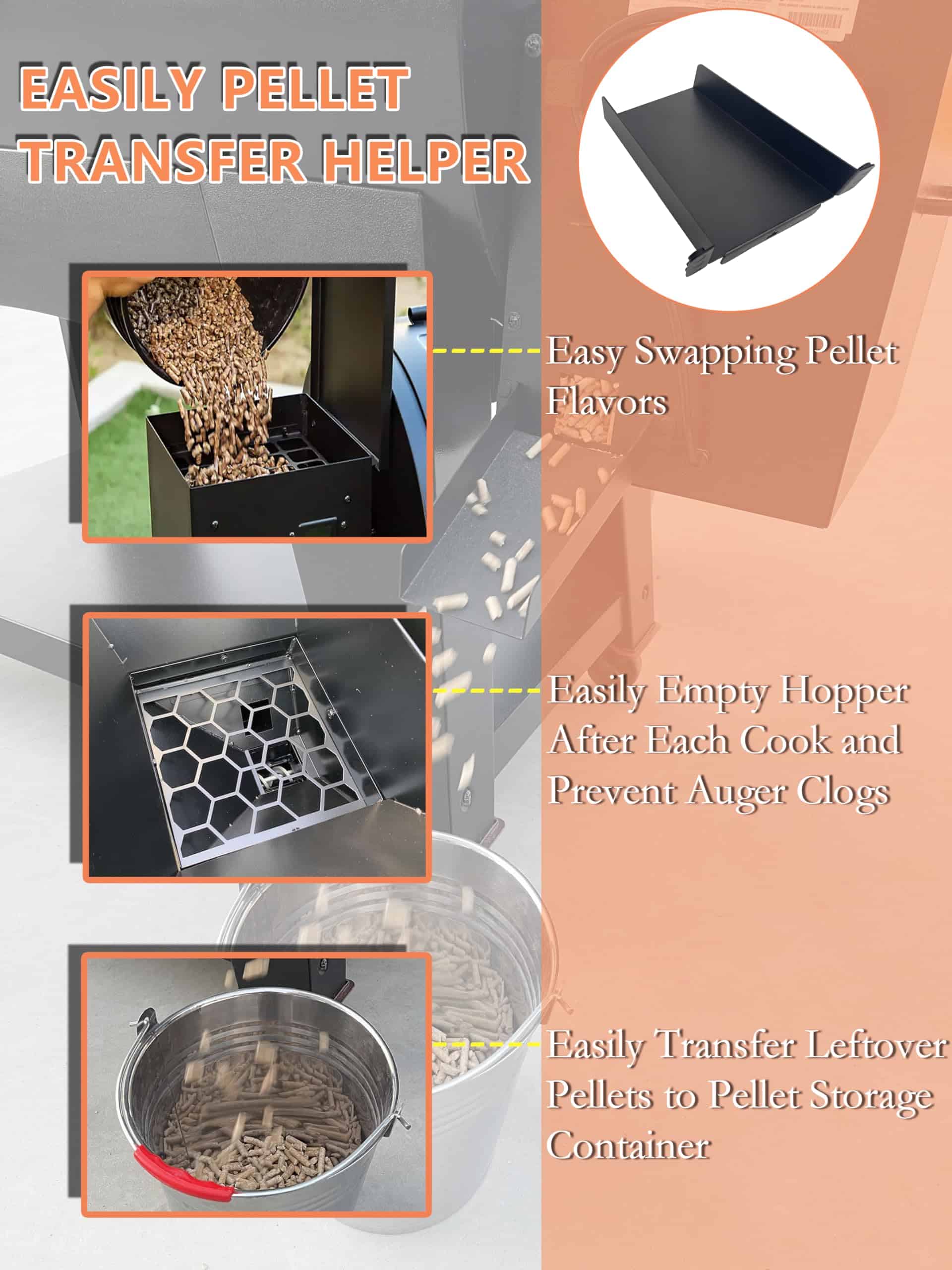 1. FÁCIL TRANSFERENCIA DE PELLETS: Los accesorios para ahumadores de pellets hacen simple intercambiar sabores de pellets, transferir los sobrantes a contenedores de almacenamiento de pellets y vaciar fácilmente el hopper después de cada cocinado, ayudando a prevenir obstrucciones del sinfín.