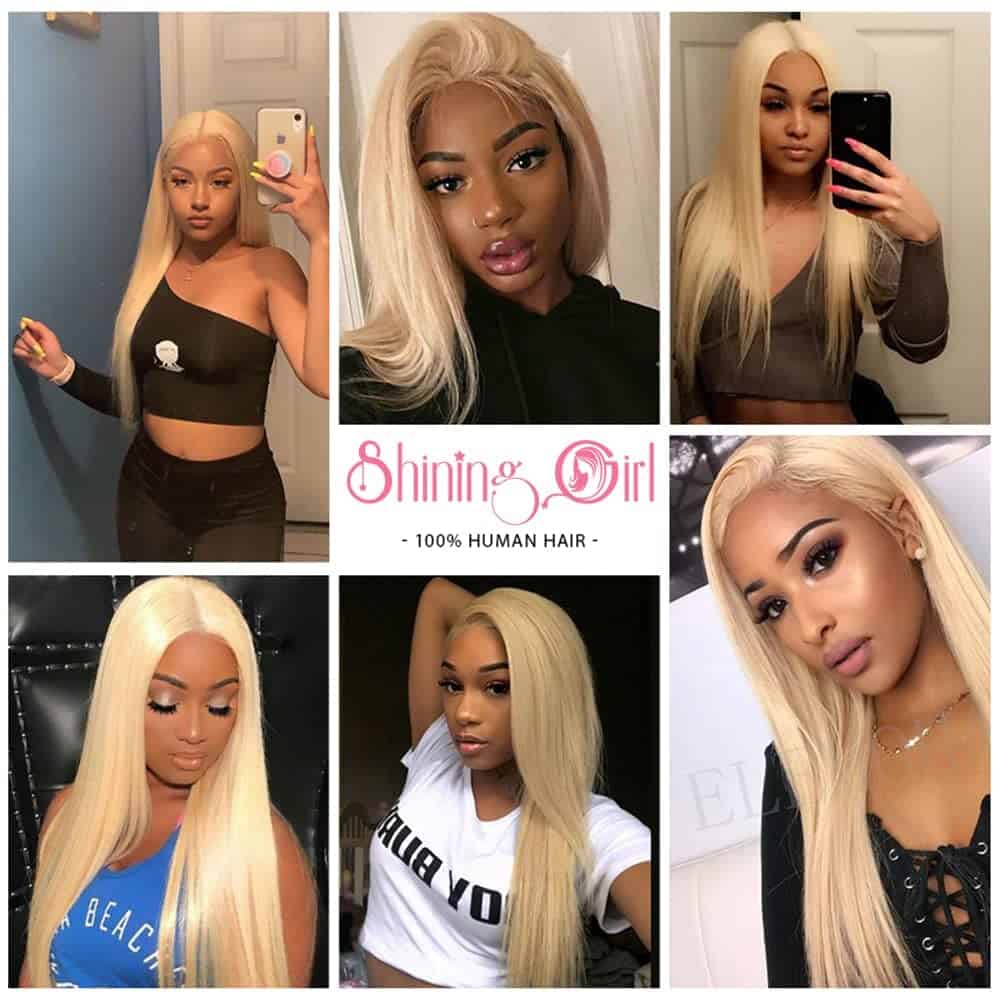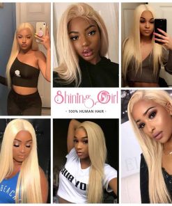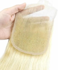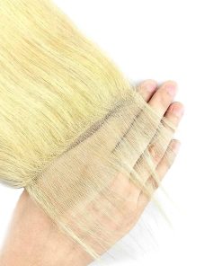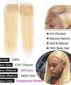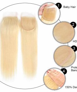 1. Cierre de cabello recto: Densidad completa del 150%, Peso: De 35 g a 50 g dependiendo de la longitud, Cierre frontal de encaje suizo de 4×4 Parte libre, Color rubio platino 613, Encaje HD transparente.