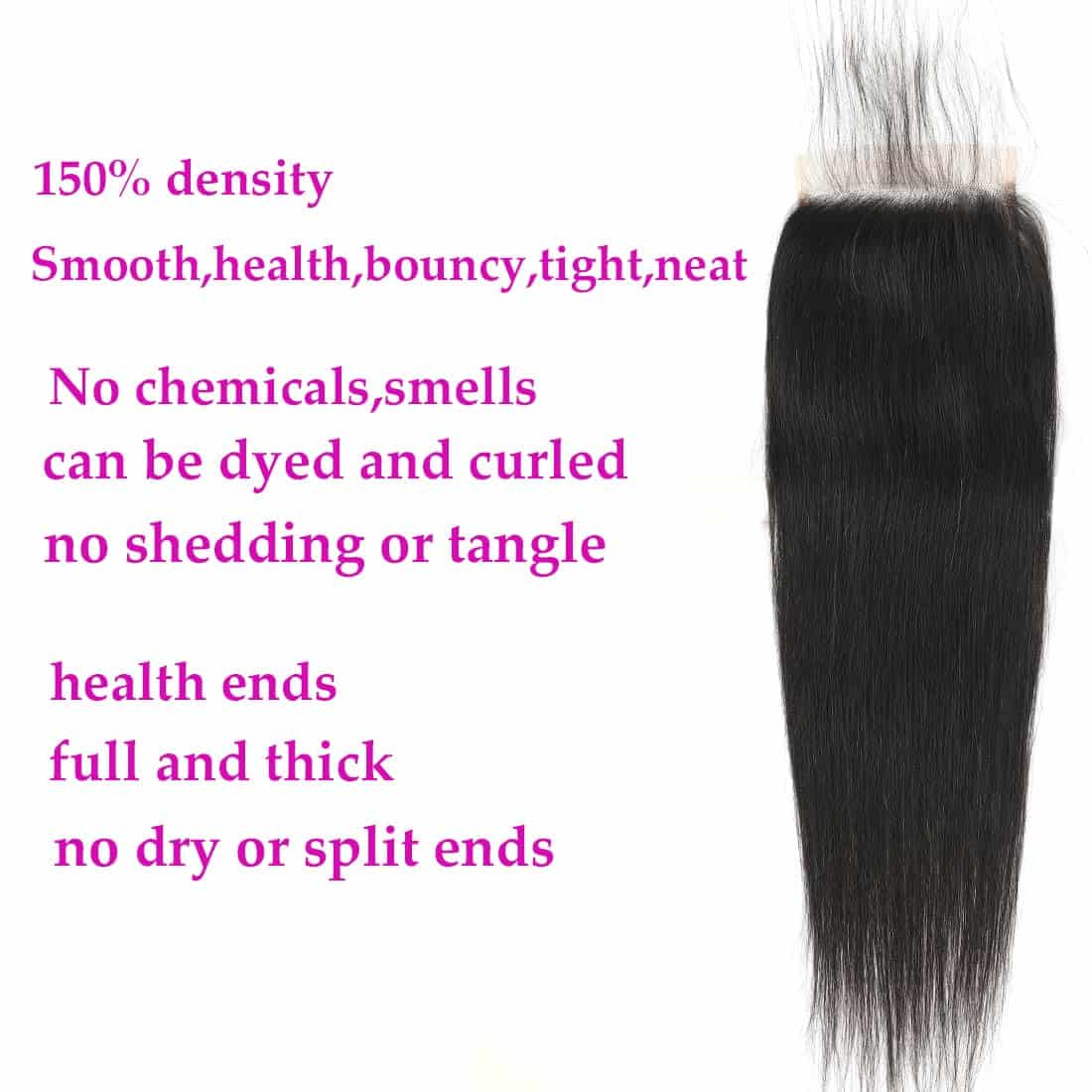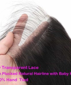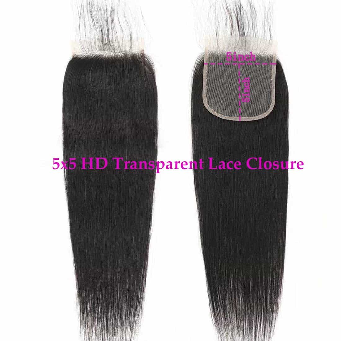 1. Cierre de Encaje de Pelo Humano Recto de 5×5 HD Transparente Premium Material: Grado 12A 100% Pelo Humano Virgen Remy Brasileño sin Procesar que se corta directamente de un solo donante joven; Encaje Suizo de 5×5 de Parte Libre, Alinie toda la cutícula; Duradero, Evita la Caída o Calvicie, Suave Y Saludable, Se Puede Teñir, Decolorar, Alisar. Textura Saludable, Sin Caída y Sin Enredos; Color Negro Natural Recto Cierre Delantero de Encaje de Pelo Humano.
