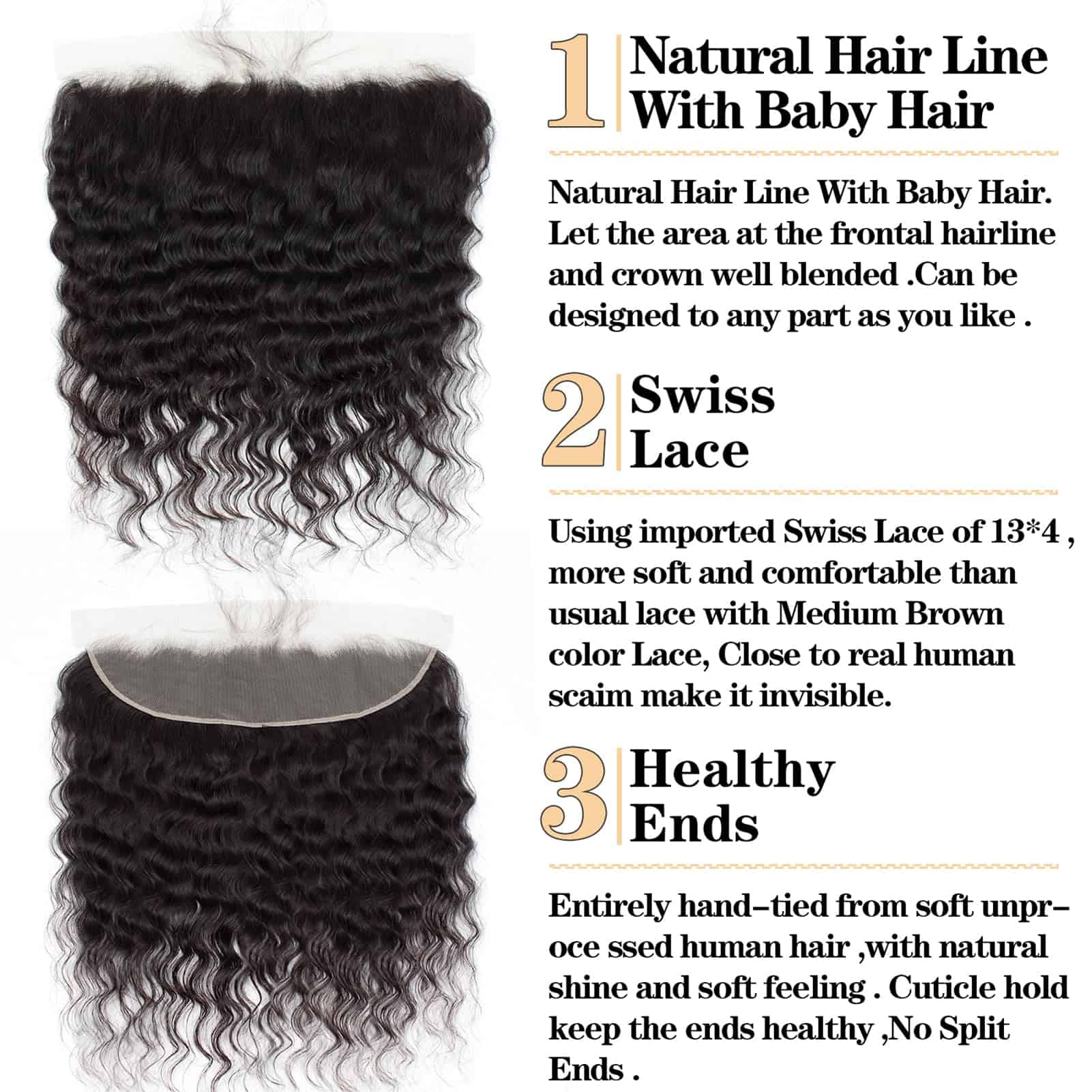5) Peso y Longitud Frontal: 60-85g/pc (1.9-2.8oz), 12-22 pulgadas (Por favor, estire el pelo recto y luego mida).