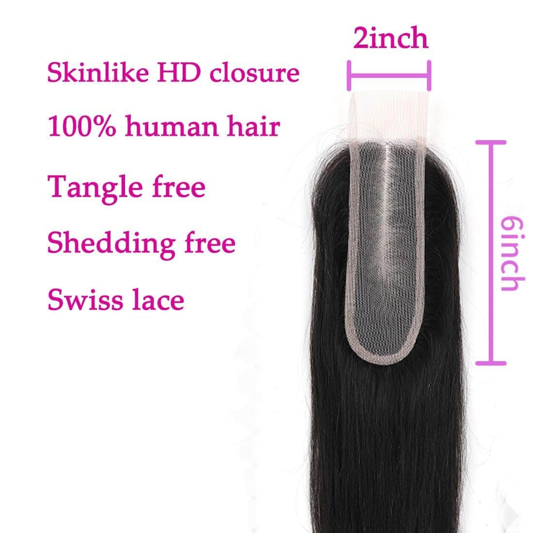 2×6 Cierre de Cabello Humano Recto HD Transparente Skinlike con Sistema de Control de Calidad Estricto: Material de cabello humano brasileño 100% sin procesar. Verdadero en longitud, completo en peso, suave y saludable, aspecto completo y natural. Densidad del 150%. No se cae ni siquiera después de lavar. Puede ser teñido, alisado, decolorado o restilizado como tu propio cabello.