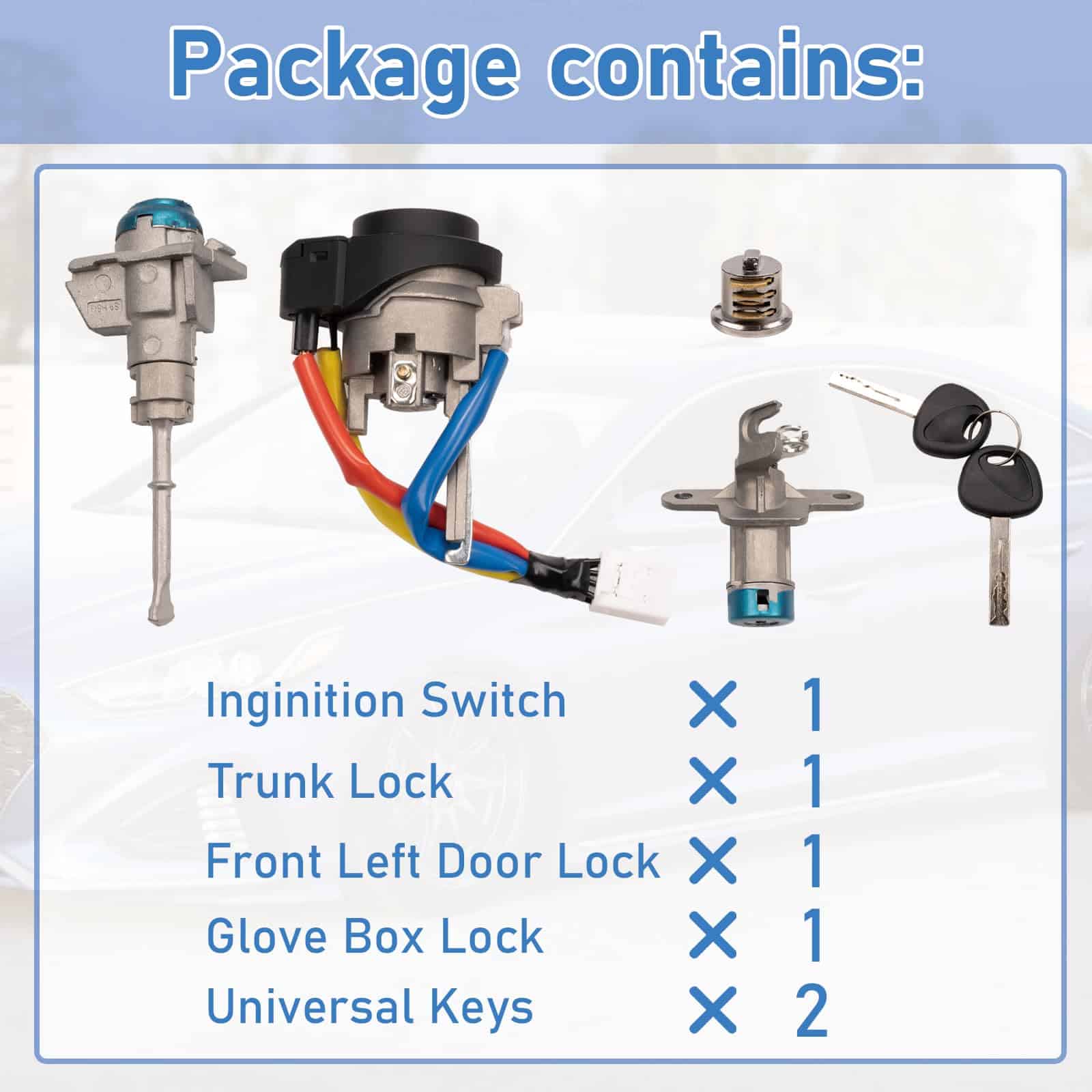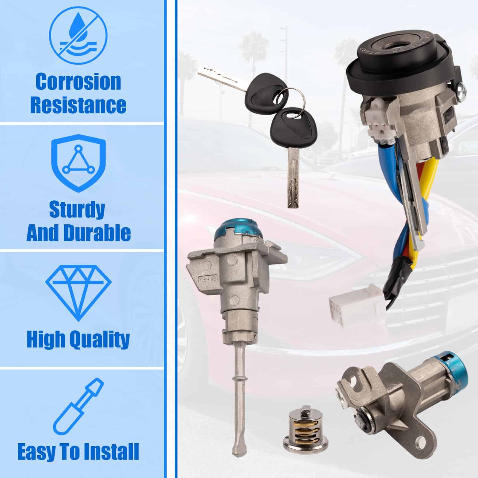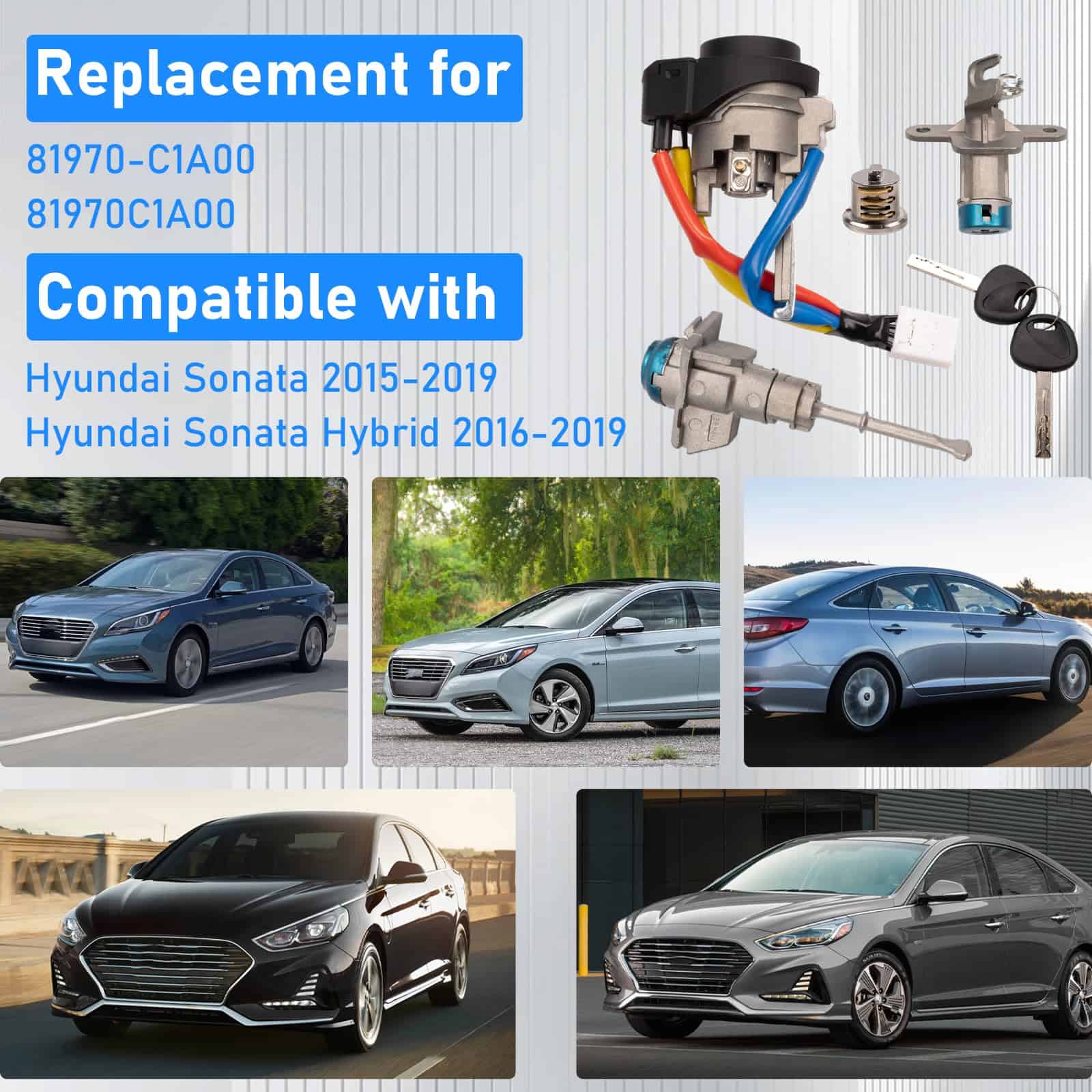 Reemplace fácilmente el cilindro del interruptor de encendido de su Hyundai Sonata con este kit de cilindro de interruptor de encendido de bloqueo de puerta completo. Compatible con los modelos Hyundai Sonata 2015-2019 y Hyundai Sonata Hybrid 2016-2019, este kit viene completo con un interruptor de encendido, cerradura para maletero, cerradura de la puerta delantera izquierda y cerradura de la guantera. Además, incluye 2 llaves universales que son aplicables a los tres tipos de cilindros de cerradura mencionados. Con una garantía de 12 meses, puede estar seguro de la calidad y durabilidad de este producto. ¡Reemplace su cilindro de interruptor de encendido con confianza y disfrute de la tranquilidad que le ofrece nuestra garantía!