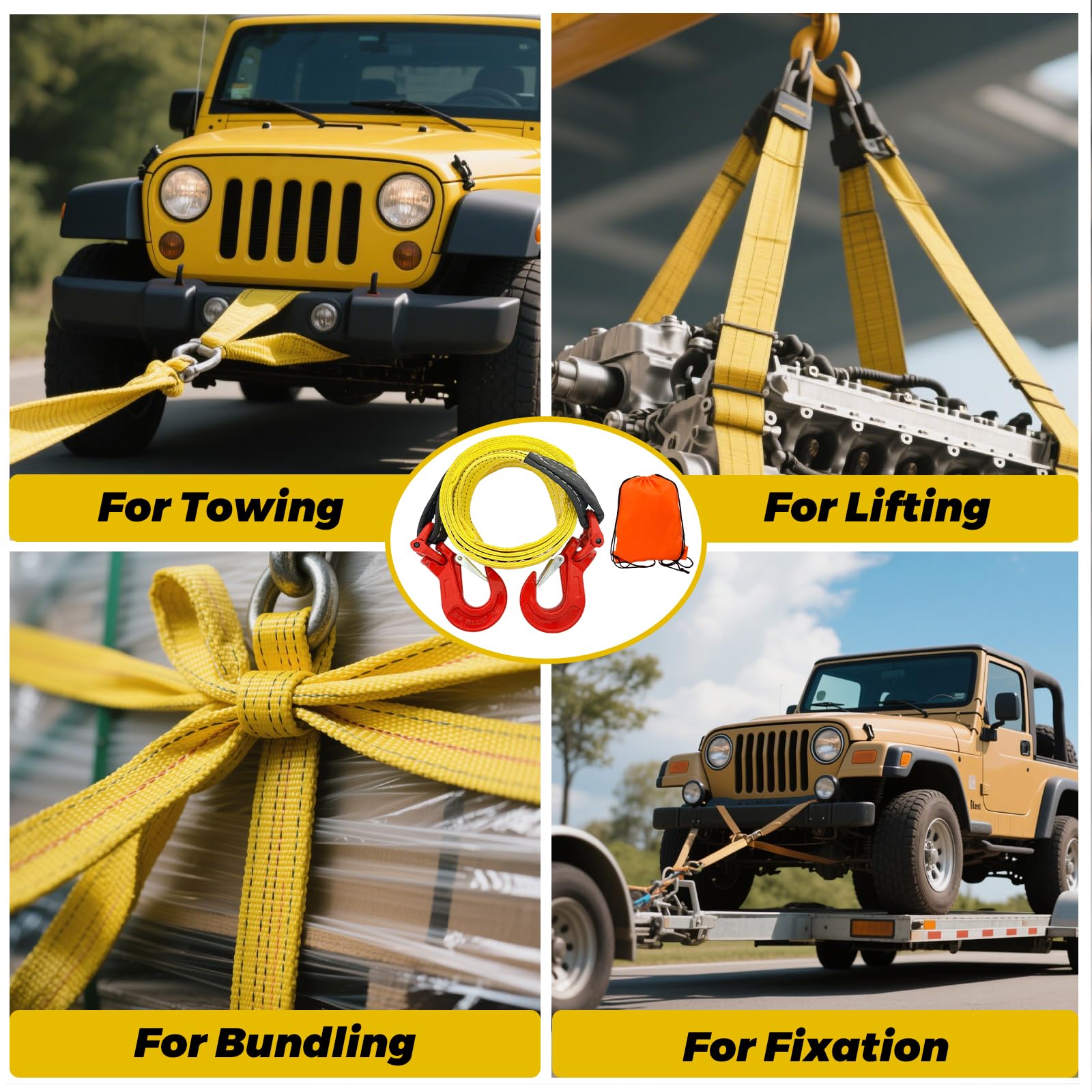 Cintas de Remolque HENBOW con Ganchos de la más alta calidad, fabricadas con fibra de poliéster de alta resistencia que garantiza durabilidad y resistencia al desgaste. Estas correas de remolque tienen una vida útil más larga que las cadenas de remolque convencionales, al tiempo que son más ligeras y fáciles de transportar. La especificación de seguridad es clave en estas cintas, con una carga de trabajo segura de 6900 libras y una carga de rotura de 27600 libras, ofreciendo un factor de seguridad superior para mayor tranquilidad. La correa de remolque de 3 pulgadas por 10 pies viene equipada con 2 ganchos de ojo y grilletes G80, con una carga de seguridad de 6600 libras y una carga de rotura máxima de 26400 libras. El color brillante de la cinta de remolque, con gancho y grillete rojos, junto con la correa amarilla brillante, aumenta la visibilidad para alertar a otros conductores y peatones, mejorando la seguridad vial. El paquete incluye ganchos de ojo G80 con pestillo de seguridad para una conexión y desconexión rápida, además de una bolsa de almacenamiento con cordón para guardar y transportar la correa de remolque de forma conveniente. Con una amplia aplicación, estas cintas de remolque resistente son adecuadas para todo tipo de vehículos, desde rescates en carretera hasta amarres de transporte y elevación de equipos, proporcionando una solución versátil para las necesidades de remolque.