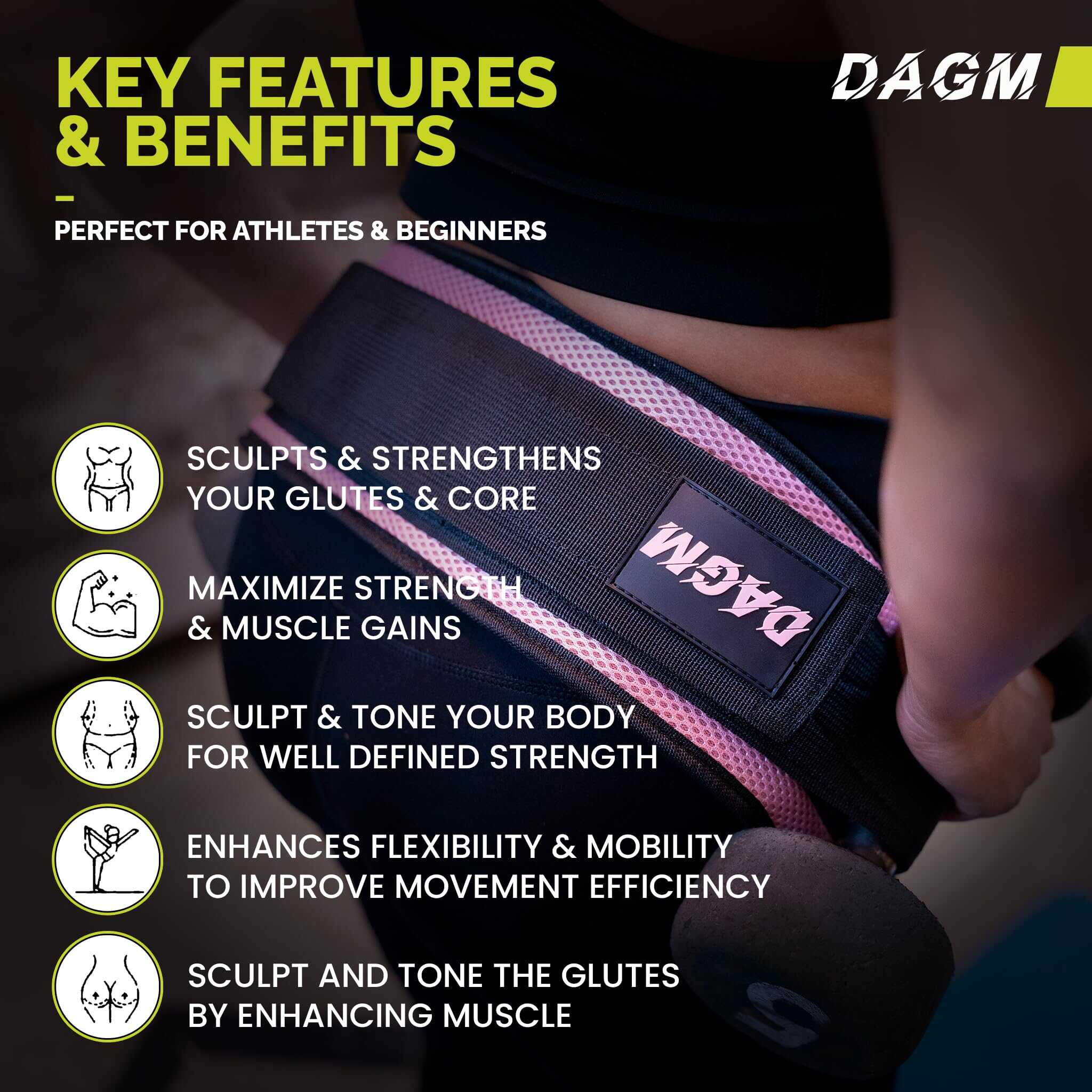 Nuestro cinturón de hip thrust DAGM te permite realizar ejercicios de hip thrust de manera eficiente en cualquier lugar, ya sea en casa, en el gimnasio o en cualquier otro lugar. Es apto tanto para principiantes como para profesionales, soportando pesos de hasta 500 lbs, incluidos kettlebells, pesas y Placas. Con un acolchado suave y un agarre seguro, mantendrás tus caderas cómodas durante tus entrenamientos, evitando el malestar. El diseño inteligente de nuestro cinturón de hip thrust garantiza estabilidad y seguridad, con un acolchado especial que evita que los pesos se resbalen. La correa sostiene pesos pesados de alta resistencia, lo que te proporciona un mejor equilibrio y seguridad en comparación con el uso solo de una barra. Configurarlo es muy sencillo, solo tienes que envolverlo alrededor de tus pesas, abrocharlo, y ¡listo para empezar! Con nuestro cinturón DAGM, puedes realizar una variedad de ejercicios, no solo hip thrusts. Agregar pesos como kettlebells, Placas y pesas hará que tus entrenamientos sean más desafiantes y te ayudará a enfocarte en diferentes grupos musculares. Este es el equipo de hip thrust perfecto para todas tus necesidades de ejercicio físico.