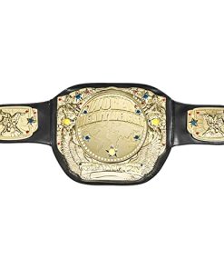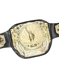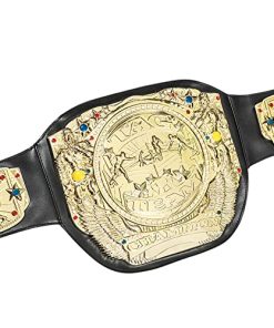 Cinturón de Juguete de Campeonato de Lucha Giratoria Tamaño Infantil con Cuatro Placas Centrales. ¡Este es un gran regalo para los niños que quieren convertirse en el próximo campeón de la lucha! Viene con cuatro placas centrales de campeonato giratorias diferentes: Campeonato Mundial Peso Pesado, Campeonato de los Estados Unidos, Campeonato Intercontinental y Campeonato en Parejas. Para intercambiar la placa central giratoria, simplemente empuje a través del agujero en la parte trasera del cinturón para sacar la placa y reemplazarla con otra. ¡Es como obtener cuatro cinturones por el precio de uno! Incluye un imán que mantendrá la placa en la posición correcta cuando haya terminado de girar. Las placas están hechas de plástico. También incluye dos placas laterales no removibles. Correa velcro ajustable que se ajusta hasta una cintura de 32 pulgadas. La placa central mide aproximadamente 8.6 pulgadas de alto por 9.5 pulgadas de ancho. Las placas circulares tienen un diámetro de 6.5 pulgadas. Las placas laterales miden 3 pulgadas de alto por 4.5 pulgadas de ancho.
