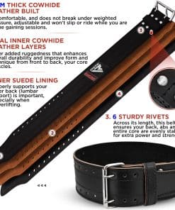 1. ESTABILIDAD DE NÚCLEO SÓLIDO No te preocupes más por la estabilidad mientras levantas pesas. Hecho de cuero de vaca genuino y con un grosor de 6 mm, este cinturón de levantamiento de pesas maximiza la estabilidad interna del núcleo y la presión abdominal. Este cinturón de levantamiento de potencia facilita la realización de sesiones de entrenamiento de levantamiento de pesas muertas, sentadillas, levantamiento de pesas olímpico y entrenamiento cruzado, entre otras rutinas de fitness y ejercicio.