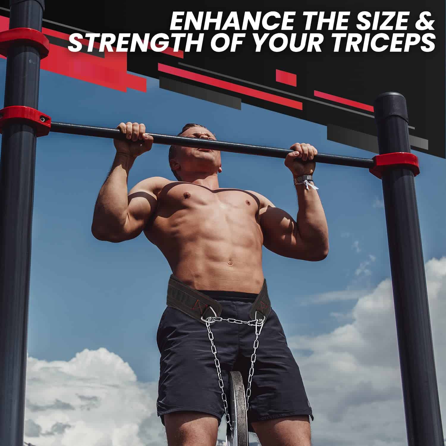 3. Desbloquea Ganas con el Cinturón de Dominadas: Eleva tus ejercicios como Dominadas con Peso para unos tríceps y pecho esculpidos, Dominadas con Peso para una espalda poderosa y Sentadillas para un cuerpo inferior más fuerte. Carga placas de peso con confianza usando nuestro cinturón de levantamiento de pesas con cadena.