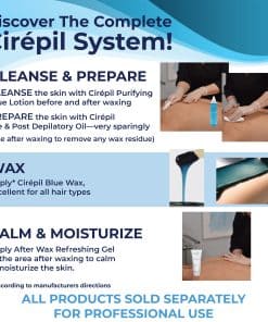 Cirepil – Blue – 800g Wax Beads son las originales perlas de cera dura profesional, diseñadas exclusivamente para uso profesional. Las fórmulas patentadas de Cirepil, de alta calidad y ultra-fluidas, permiten que la cera pueda ser utilizada en todo tipo de vello, ya sea corto, afeitado, largo, suave o grueso. La cera Cirepil envuelve el vello para una fácil y completa remoción. Esta cera clásica de Cirepil es excelente para todas las áreas del cuerpo, incluyendo brasileño/bikini, pero también brazos, piernas, rostro, axilas o espalda. Puede utilizarse en todo tipo de vello y piel gracias a su textura en gel. Nunca será pegajosa y los resultados son duraderos. La calefacción a baja temperatura es amigable para tu piel, lo que también significa menos dolor y enrojecimiento. Como siempre, formula libre de gluten, parabenos y vegana. La cera Cirepil es fácil y conveniente de usar. ¡Ahorra tiempo y dinero, no son necesarias las tiras! La temperatura baja y suave permite una aplicación más cómoda pero rápida y fácil remoción. Utiliza un recipiente y el Calentador de Cera Cirepil (calentador obligatorio) para derretir la cantidad deseada de perlas. Después de la consulta, prueba la temperatura de la cera. Prepara la piel con la Loción y Aceite Cirepil, revisa el crecimiento del vello. Aplica una capa fina y pareja de cera en la dirección que crece el vello. Retira en dirección opuesta, cerca de la piel. Termina con productos post-depilatorios. – NO SE REQUIEREN TIRAS, FÁCIL REMOCIÓN MANUAL –
