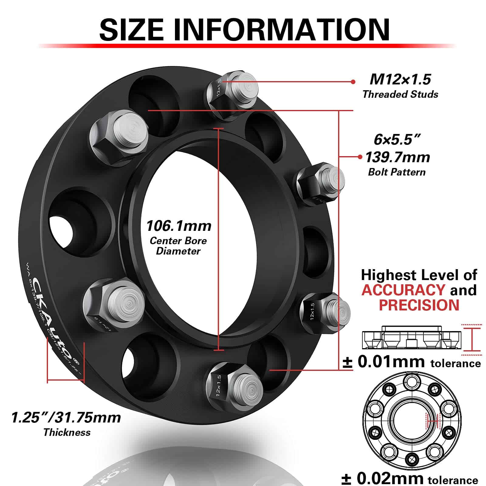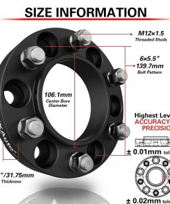 1. ESPECÍFICO DEL VEHÍCULO: Nuestro adaptador de rueda solo se ajusta al 4Runner 1989-2021 / FJ Cruiser (XJ10) 2007-2020 / Land Cruiser 1982-1997 / Land Cruiser Prado 1990-2021 / Tundra 2000-2006 / Ventury (H200) 2004-2019 / Sequoia 2001-2007 / Fortuner (AN50/AN60) 2005-2015 / Fortuner (AN150/AN160) 2015-2021 / Tacoma 1995-2015(4WD/Pre-Runner/VVT-i) / Tacoma 2016-2021 / Hilux 1979-2020(4WD) / GX (J120) 2002-2009 / GX (J150) 2010-2021. 2. ESPECIFICACIÓN DE LOS SEPARADORES DE RUEDA – Patrón de Pernos del Vehículo 6×5.5″ (6×139.7mm) / Espesor 1.25 pulgadas / Orificio del Cubo 106.1mm / Paso de Rosca M12x1.5 / Longitud Efectiva del Perno 25mm, el procesamiento automático CNC mantiene el error dentro de 0.02mm. 3. GARANTÍA DE ALTA CALIDAD – Forjado de aleación de aluminio 6061 de grado aeroespacial, anodizado superficial y tratamiento térmico T6, garantizan la estabilidad y también mejoran la dureza y resistencia a la corrosión del material. 4. DISEÑO RESISTENTE – Separadores de rueda centrados en el cubo diseñados con un cuello central engrosado que asegura un ajuste exacto de la rueda y elimina la vibración, los pernos de nivel 12.9 con tratamiento de recubrimiento dacromet también mejoran la resistencia de la brida a partir de detalles. 5. SERVICIO DE GARANTÍA – Proporcionamos a usted como comprador original del Adaptador de Rueda CKAuto, garantizamos el Producto contra defectos de materiales y mano de obra bajo uso normal durante toda la vida del Producto.