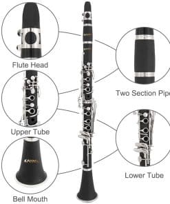 1. FÁCIL DE TOCAR: Los clarinetes Bb de KAYATA son fáciles de usar y adecuados para principiantes o amantes intermedios del clarinete. 2. HERMOSO SONIDO: Clarinete para principiantes equipado con 17 llaves, este clarinete para principiantes tiene una respuesta rápida de las teclas y una facilidad de ejecución suave, junto con una amplia gama de tonos, que brinda un sonido puro y una tonalidad rica. 3. APARIENCIA ÚNICA: Llaves niqueladas, reposabrazos ajustable, cuerpo de baquelita negro y aros más delgados atractivos hacen que el clarinete sea más elegante y hermoso, también es atractivo y duradero. 4. CLARINETE DE ALTA CALIDAD: El cuerpo de baquelita de alto nivel aporta un tono enfocado y claro. Estuche de tela ligero para un transporte rápido y fácil. 5. ACCESORIOS INCLUIDOS: Grasa de corcho, paño de limpieza suave, bolsa de transporte ligera de tela.