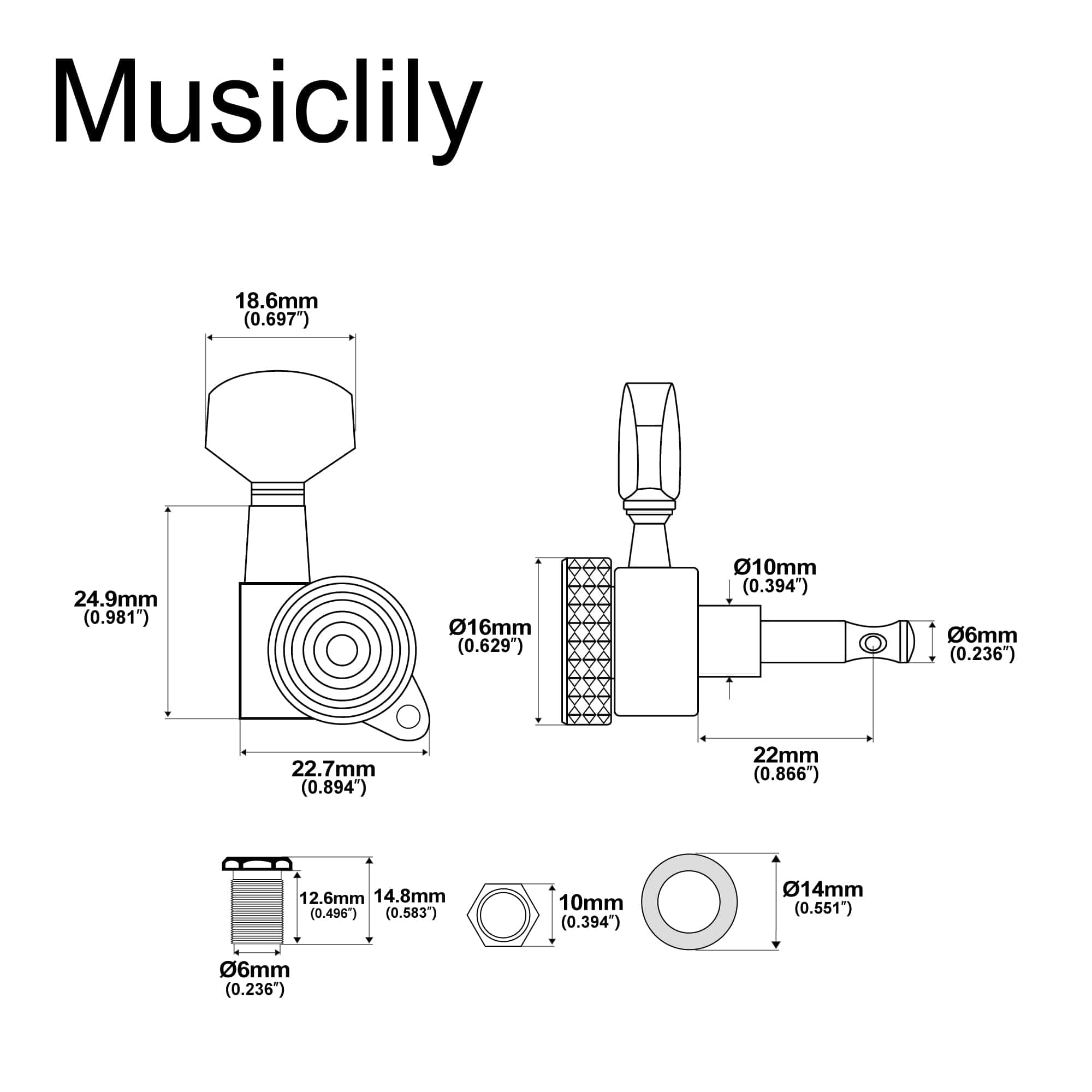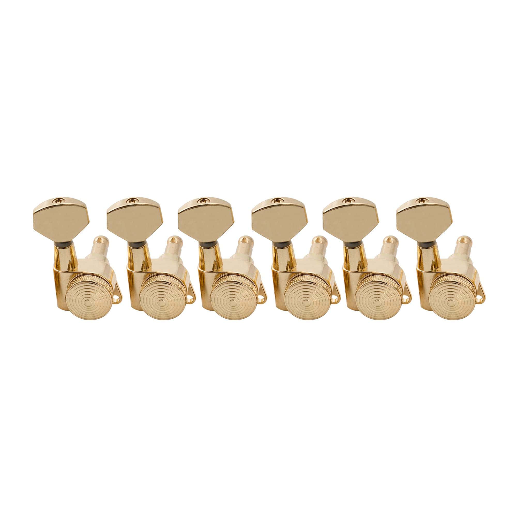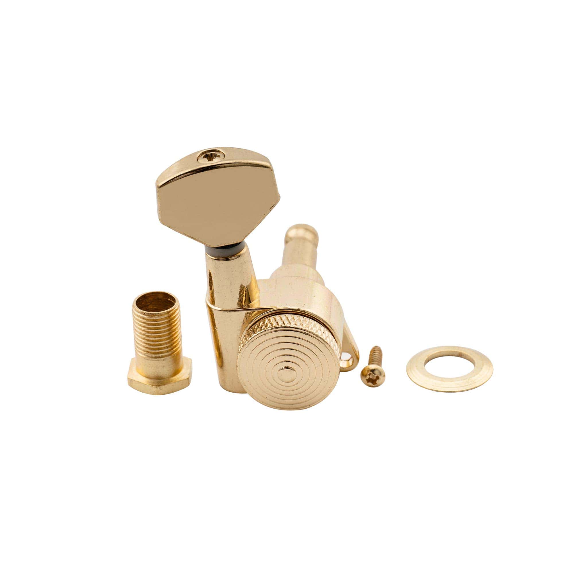 Clavijas de afinación con bloqueo Musiclily Ultra 6-en-línea 19:1 para guitarra eléctrica Fender Stratocaster/Telecaster. Estas clavijas son ideales para guitarras con agujero de clavija moderno de 10 mm y cuentan con un diseño clásico estándar con una relación de 19:1 para una afinación suave. Fabricadas en metal completo y con un acabado electroplateado de calidad, estas clavijas son duraderas y fáciles de usar. El juego completo de 6-en-línea incluye todos los accesorios de montaje necesarios para una instalación sencilla.