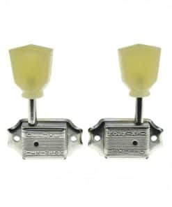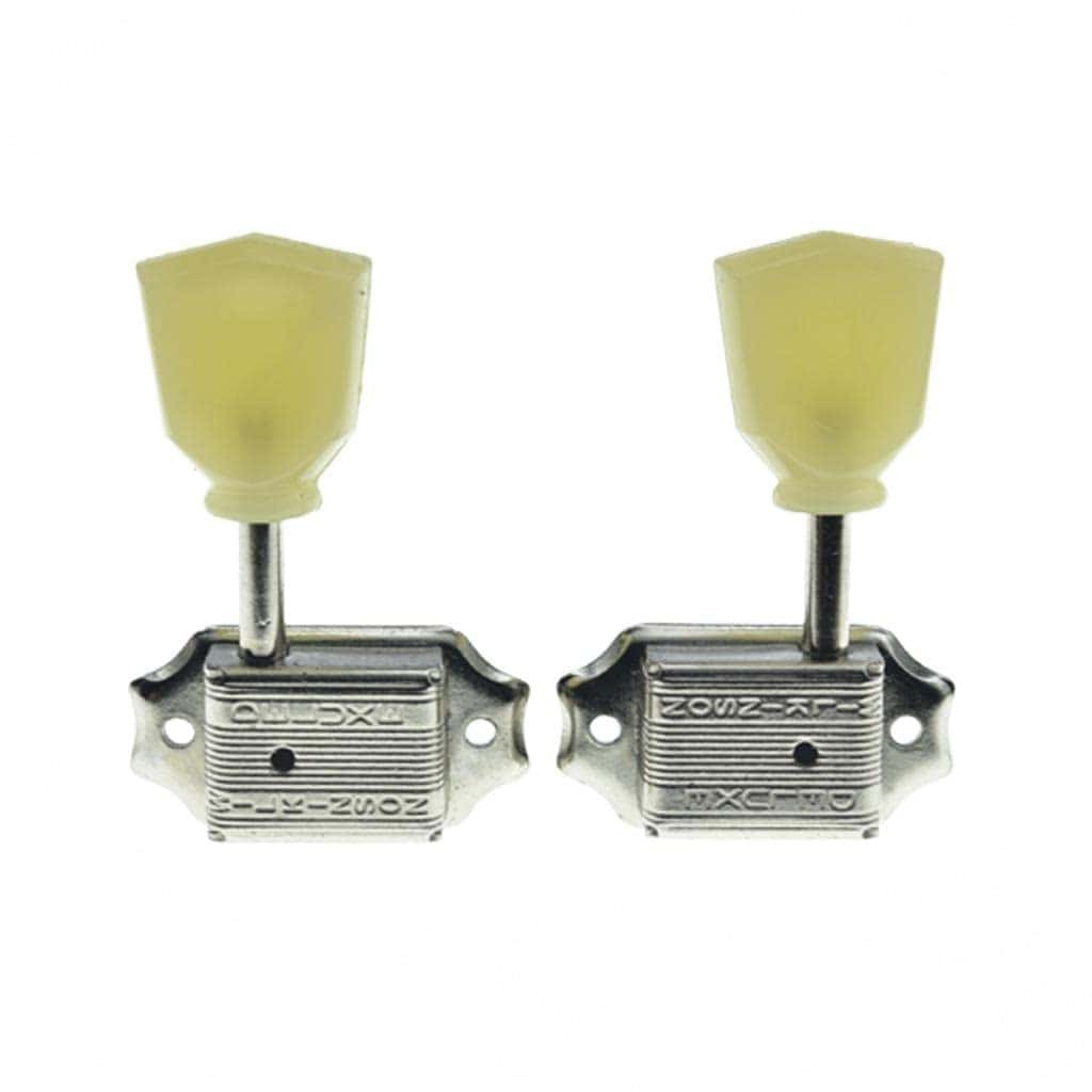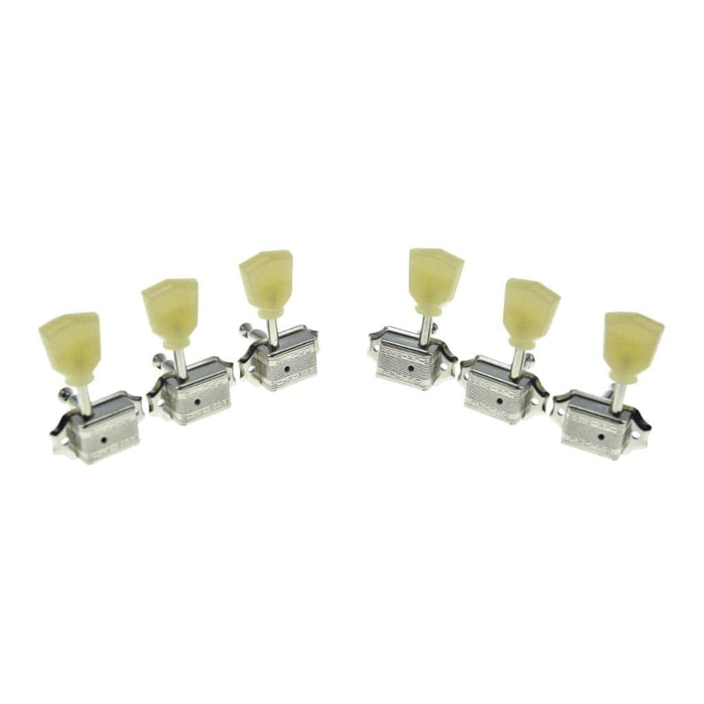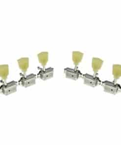 Clavijas de afinación de guitarra WILKINSON niqueladas con botones vintage 3×3 Deluxe para Les Paul/SG/ES. Estas clavijas de afinación individuales de WILKINSON vienen con botones verdes o de plástico vintage y se adaptan a la mayoría de las guitarras de la serie Les Paul/SG/ES u similares con agujeros de sintonizador de 8.5mm a 9mm. Con un aspecto vintage agradable y una relación de afinación de 15:1, estas clavijas están empacadas con nuestro propio embalaje para WILKINSON. Son duraderas, mantienen la afinación y facilitan la sintonización suave. Tenga en cuenta que las instrucciones no están incluidas, por lo que se recomienda consultar a su lutier local para instalar estas clavijas correctamente. Con variedad de selecciones para Cuerda a Poste o Poste de Eje Dividido, y la opción de botón verde o botón vintage, estas clavijas vienen completas con casquillos y tornillos para una instalación sencilla.