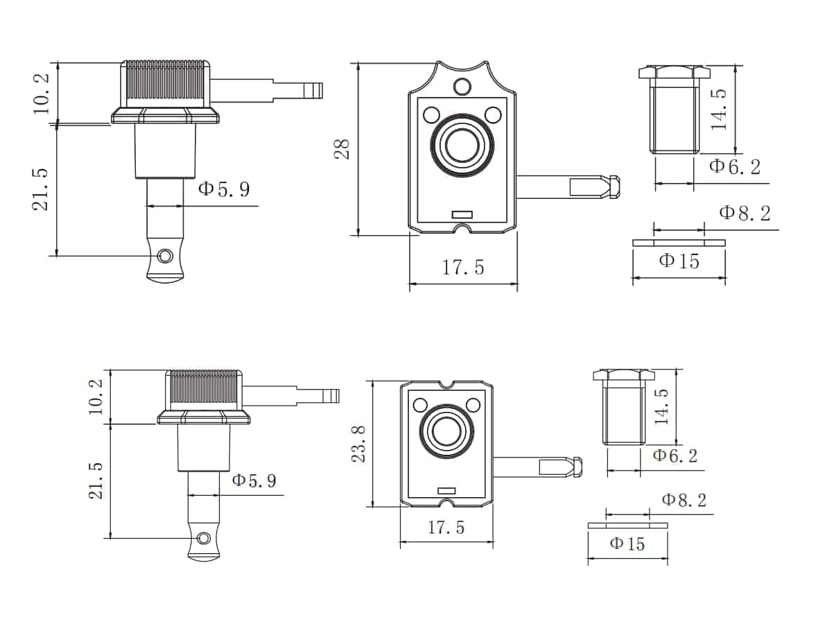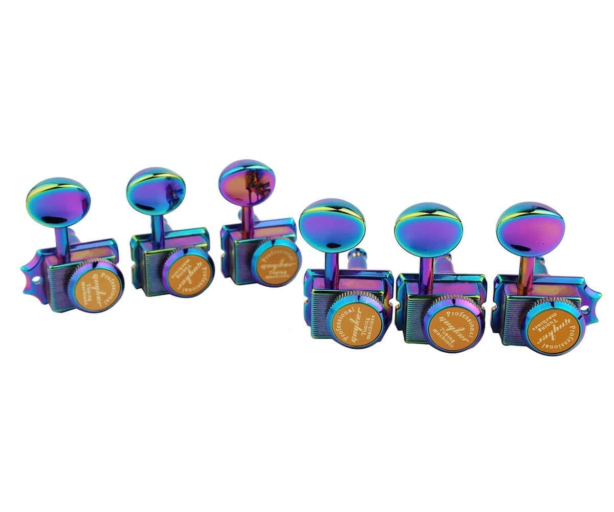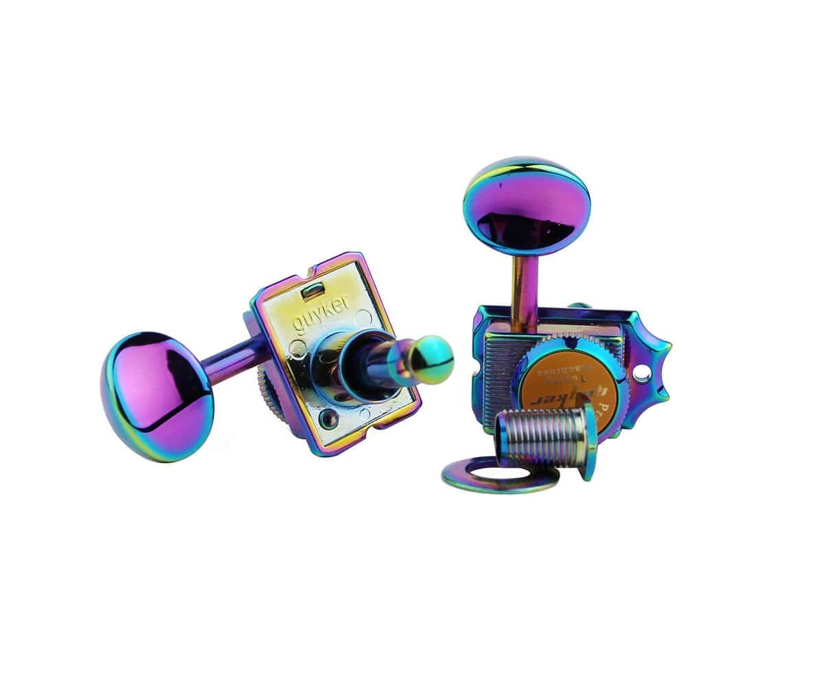 Las clavijas de bloqueo Guyker vintage de 6 en línea son ideales como repuestos de machine heads de afinación con bloqueo para guitarras eléctricas de estilo ST TL. Presentan una relación de engranaje de precisión de 15:1 con lubricación sellada, carcasas de fundición y perillas de metal para garantizar un afinado más fino y una mayor estabilidad. Además, vienen con hardware de montaje (tornillos, casquillos y arandelas) incluido para una fácil instalación. Las máquinas de afinación selladas para guitarra están equipadas con engranajes internos de alta resistencia, lo que las hace robustas y convenientes para su uso. La relación de engranajes es de 1:15 y presentan un botón de forma ovalada con carcasa sellada. Antes de realizar su pedido, por favor verifique el dibujo de los parámetros en las imágenes adjuntas para asegurar la compatibilidad con su guitarra.