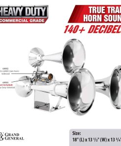 El claxon de tren de alta resistencia de Grand General está hecho de un material de alta calidad de forma única. Esto permite un sonido de tren real que no ofrece nadie más. Las trompetas están luego cubiertas con un acabado de cromo triple de alta calidad y se empaquetan con un robusto soporte de acero inoxidable en forma de «L» y solenoide. Los juegos de soportes de montaje en suelo para claxon de tren y palancas de válvula de aire están disponibles en 4″ (69977), 7″ (69979) y 11″ (69982).