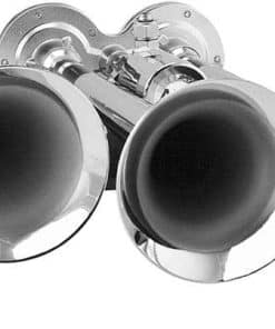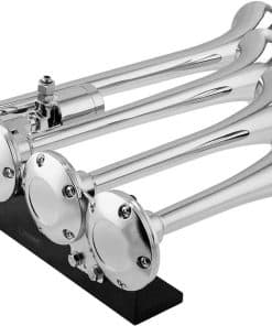 Este potente claxon de trompeta cuádruple produce un sonido fuerte y atronador. Con aspecto cromado, hecho completamente de metal para una máxima protección contra todas las condiciones climáticas. El claxon viene con un solenoide resistente de 12V, manguera y hardware de montaje. Se requiere un sistema de aire a bordo para la operación. Ideal para todos los vehículos con un sistema de 12V. Este claxon seguramente atraerá toda la atención que estás buscando. Claxon de Tren Cuádruple (Trompetas cromadas con base pintada de negro) Construcción metálica Válvula de aire eléctrica pesada de 12V (Solenoid) con un orificio de aire más grande 20% más largas Trompetas (Comparado con el modelo VXH4124C) Manguera de plástico de nailon de 3/8″ OD (6 pies) Conexión de compresión de » NPT para manguera de 3/8″ OD Hardware de montaje incluido Dimensiones: En general: 16- » L x 12- » An x 4- » Alt Trompetas: 16- » L, 13- » L, 11- » L, 9″ L x 3- » D Nota: Se requiere un sistema de aire a bordo