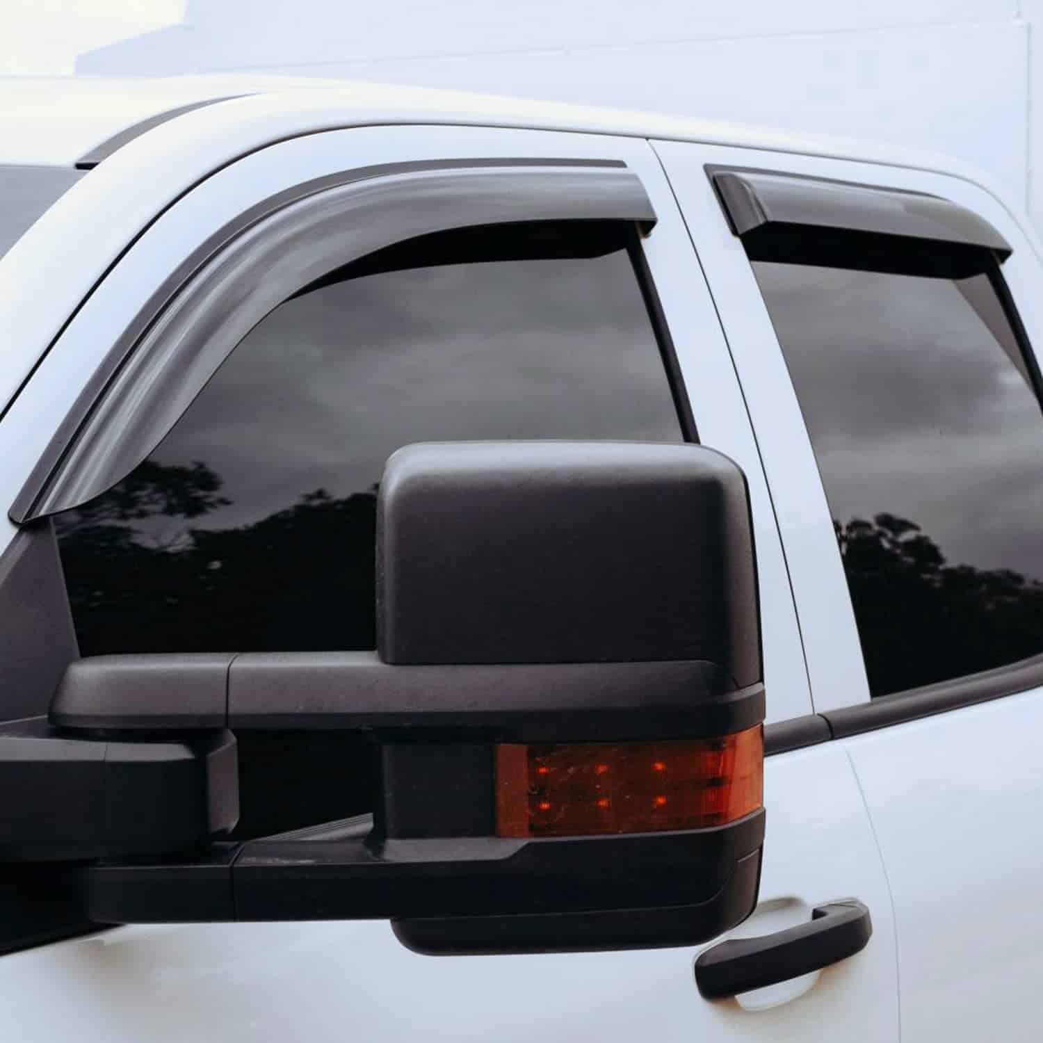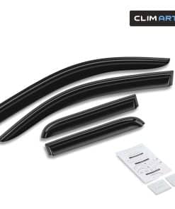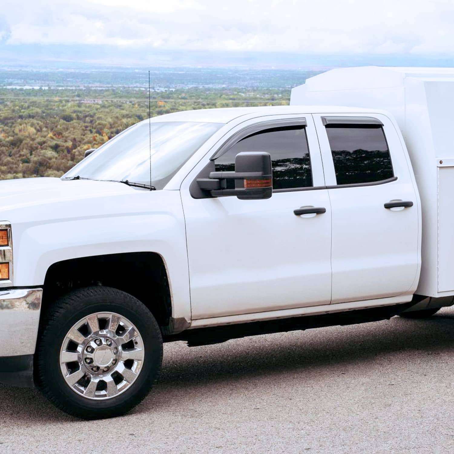 ¡Atención! ¡Estos accesorios para camionetas se AJUSTAN a medida solo para Chevrolet (Chevy) 2014-2018 Silverado 1500 Doble Cabina, 2015-2019 Silverado 2500 Doble Cabina, 2015-2019 Silverado 2500HD Doble Cabina, 2015-2019 Silverado 3500HD Doble Cabina; 2019 Silverado 1500 LD Doble Cabina; GMC Sierra 2014-2018 1500 Doble Cabina, 2015-2019 Sierra 2500HD, 3500HD Doble Cabina, 2019 GMC Sierra 1500 Limited Doble Cabina. Haz los viajes en coche más agradables. Abre las ventanas y disfruta de la brisa mientras conduces, sin preocuparte por el ruido del viento, la nieve fría, las molestas salpicaduras de lluvia o el sol ardiente con los deflectores de ventanas laterales de CLIM ART. Conduce con estilo y comodidad con nuestros accesorios para automóviles – protectores para ventanas de coche. Increíblemente duradero y elegante. Hechos con plástico premium PC resistente, duro y irrompible de color oscuro, nuestros deflectores de lluvia para ventanas cuentan con un diseño flexible y aerodinámico que no se doblará, romperá o agrietará, mientras que su diseño inteligente agrega al aspecto de tu coche. Todas las herramientas incluidas. Estos deflectores de lluvia para coches cuentan con un montaje exterior de estilo de cinta con cinta 3M para una sujeción extra fuerte. El kit de montaje incluye todas las herramientas necesarias e instrucciones completas para una instalación exitosa del visor de ventanas. ¡No se necesita taladrar! Promesa de calidad. Los deflectores de ventanas vienen con una garantía para que puedas comprar sin preocupaciones ni dudas! Sin embargo, estamos bastante seguros de que nuestros visores de ventanas de coche no dejarán de complacerte!