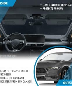 Esta cubierta para parabrisas eficiente refleja la luz solar para reducir el calor y proteger tu tapicería, evitando decoloración, grietas y daños causados por el sol. Se despliega en segundos y se guarda ordenadamente para minimizar el desorden. Almacénalo en la bolsa de transporte incluida para un acceso rápido y fácil. Disfruta de accesorios para coche de primer nivel para proteger cuero, vinilo y plásticos de los dañinos rayos UV, evitando decoloración, grietas y daños por calor. Ideal para Ford Mustang 2015-2023 y otras configuraciones de accesorios para camionetas, este protector solar asegura un ajuste personalizado, protección UV y enfriamiento interior. Construido con materiales premium para una mayor durabilidad, esta cubierta para parabrisas se destaca entre las sombrillas para ventanas de coche en el mercado mientras garantiza una protección UV y térmica superior.