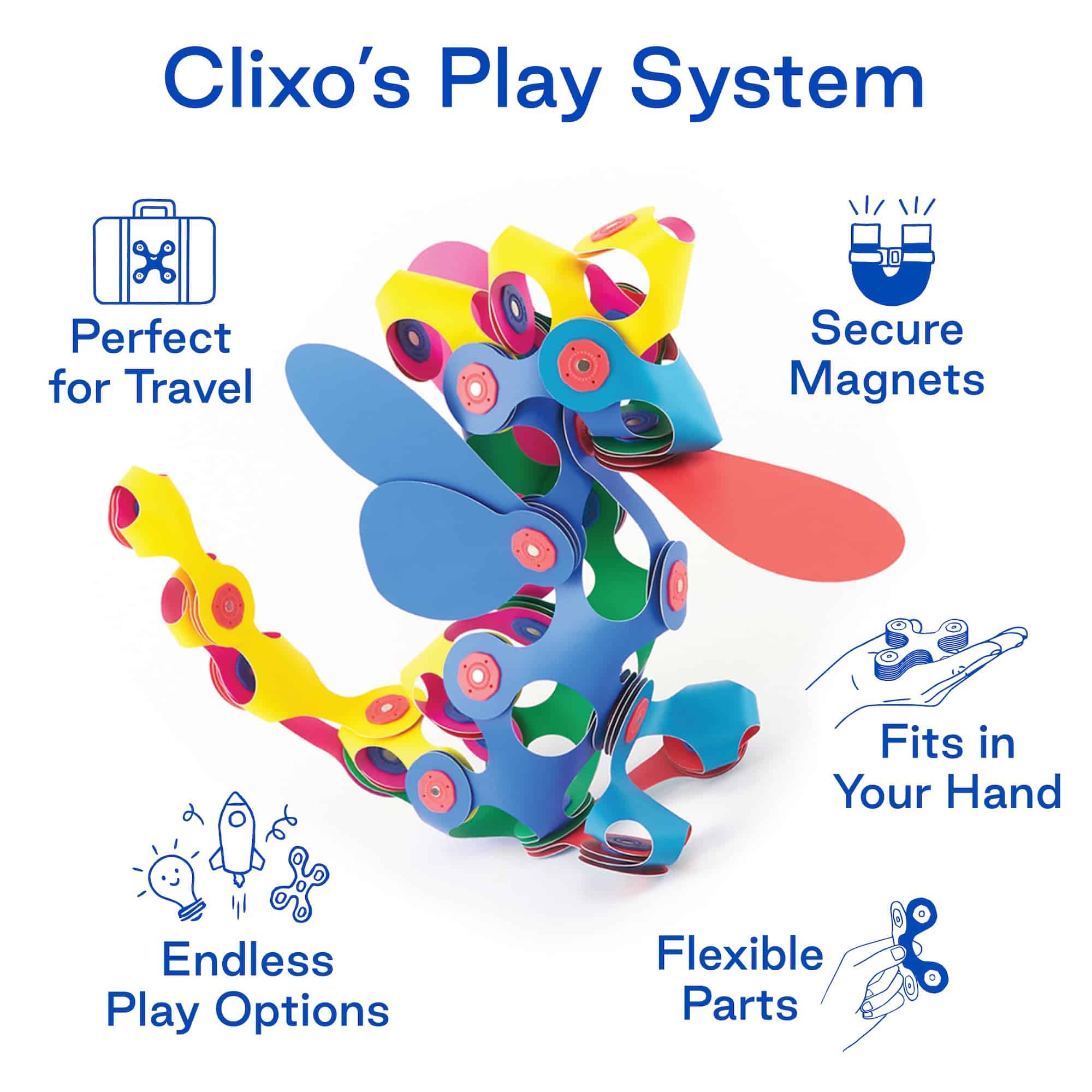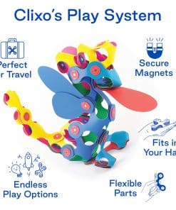 1. DESPIERTA LA IMAGINACIÓN Y CREATIVIDAD Las piezas de construcción magnéticas multipremiadas de Clixo encienden la imaginación de tu hijo como nunca antes! Con formas flexibles y conexiones magnéticas seguras, los niños pueden clicar, enganchar, doblar y flexionar para crear construcciones creativas infinitas, desde animales hasta diseños abstractos, para horas de diversión interactiva y práctica.