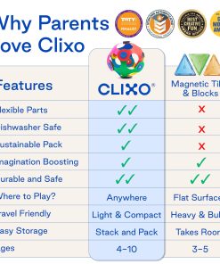 6. FÁCIL LIMPIEZA Y MANTENIMIENTO ¡La limpieza es pan comido! Las piezas de Clixo se apilan ordenadamente para un almacenamiento fácil. Después de jugar, simplemente limpia las piezas con agua y un paño, o mételas en el lavavajillas para una limpieza más profunda duraderas, lavables y listas para la próxima aventura!