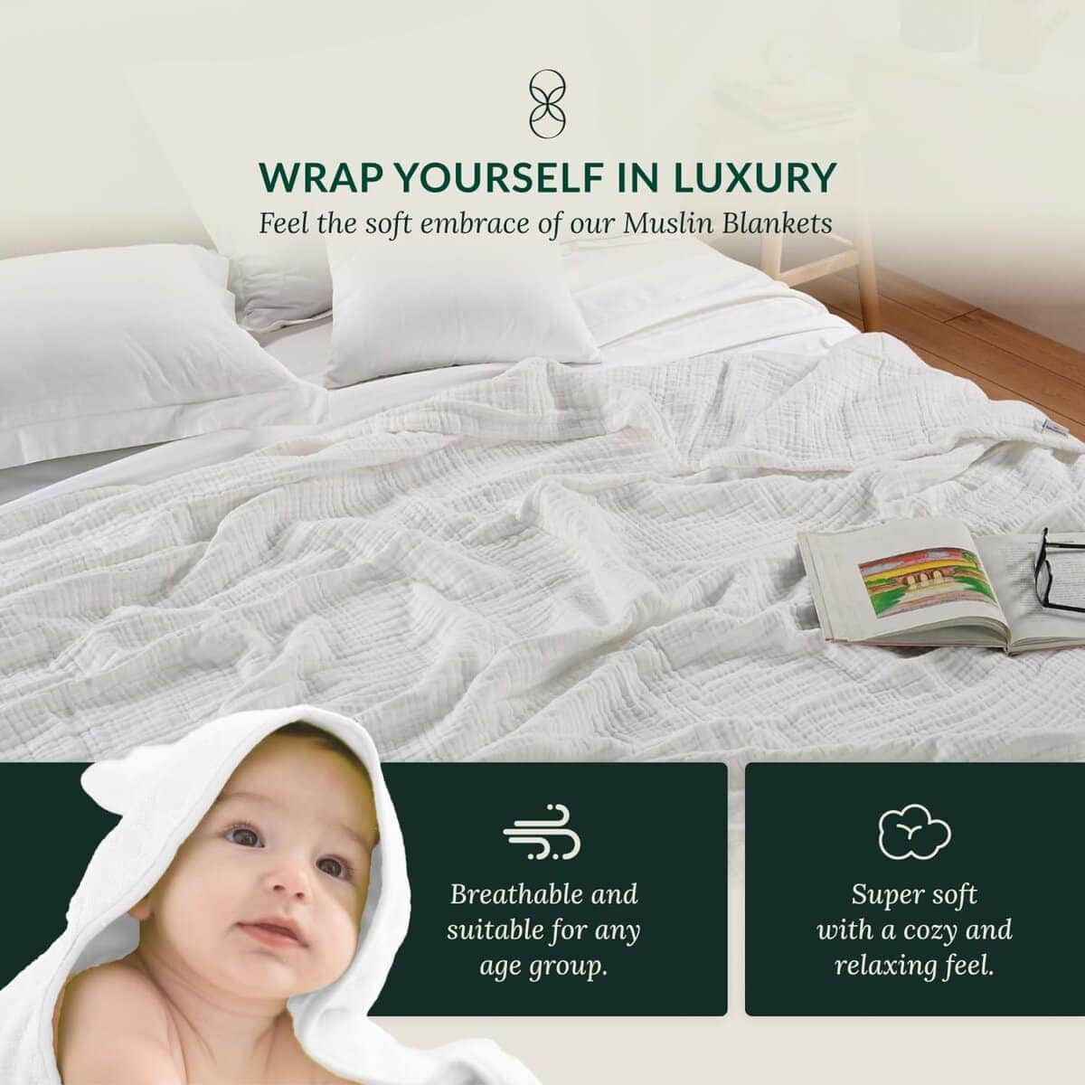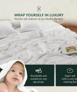 2. DESCUBRE LA COMODIDAD ÚNICA CON NUESTRA MANTA DE MUSLINA DE 8 CAPAS:- Experimenta una suavidad y lujo incomparables con nuestra Manta de Muselina de 8 Capas, hecha de 100% algodón natural. Diseñamos nuestras mantas de muselina blancas de 8 capas para garantizar un flujo de aire óptimo, manteniéndote fresco en verano y acogedor en invierno. Su magia absorbente de la humedad garantiza un sueño seco e ininterrumpido, promoviendo un descanso profundo y cómodo sin sobrecalentamiento.