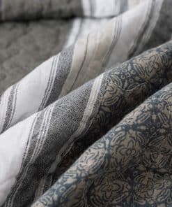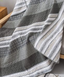 Elaborado con algodón transpirable al 100% con un relleno de 70% algodón y 30% poliéster, el cobertor Madrona asegura suavidad y comodidad para uso durante todo el año. Su construcción ligera y grosor ideal lo convierten en una elección práctica tanto para noches acogedoras en casa como para días llenos de aventuras. Con puntadas acolchadas en un patrón de bucle único, esta manta garantiza durabilidad y una capa adicional de textura. El diseño reversible presenta un patrón clásico de rayas en un lado y un sutil rayado gris y blanco en el otro, ofreciendo diversas opciones de estilo para combinar con cualquier decoración.