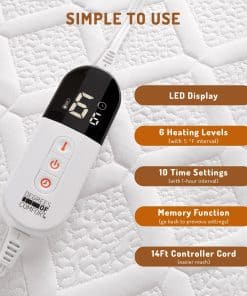 Tejido avanzado de capa de aire: Nuestro cobertor de colchón calefactado presenta un lujoso tejido de capa de aire, diseñado para una mayor transpirabilidad para mantenerte cálidamente sin provocar sobrecalentamiento, para que puedas disfrutar de un sueño reparador en esas frías noches de invierno. Más seguro y confiable: Este cobertor de colchón eléctrico está certificado por ETL y FCC, y su apagado automático por defecto de 10 horas evita que se sobrecaliente para que puedas disfrutar de calidez y comodidad con total tranquilidad. Específicamente adaptado para ti: Este cobertor de colchón calefactado de tamaño twin XL cuenta con un controlador único y una función de memoria que restaura la configuración anterior. Puedes personalizar tu calidez preferida según tus propias necesidades. Uso y mantenimiento fáciles: Este calentador de cama está diseñado para adaptarse a colchones de hasta 17″ de profundidad y cuenta con una banda elástica alrededor para mantener el cobertor de colchón en su lugar de forma segura. El cable de alimentación de 14 pies garantiza un acceso fácil a un enchufe cercano. Los controladores desmontables permiten un lavado conveniente a máquina, facilitando el mantenimiento.
