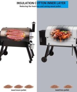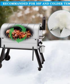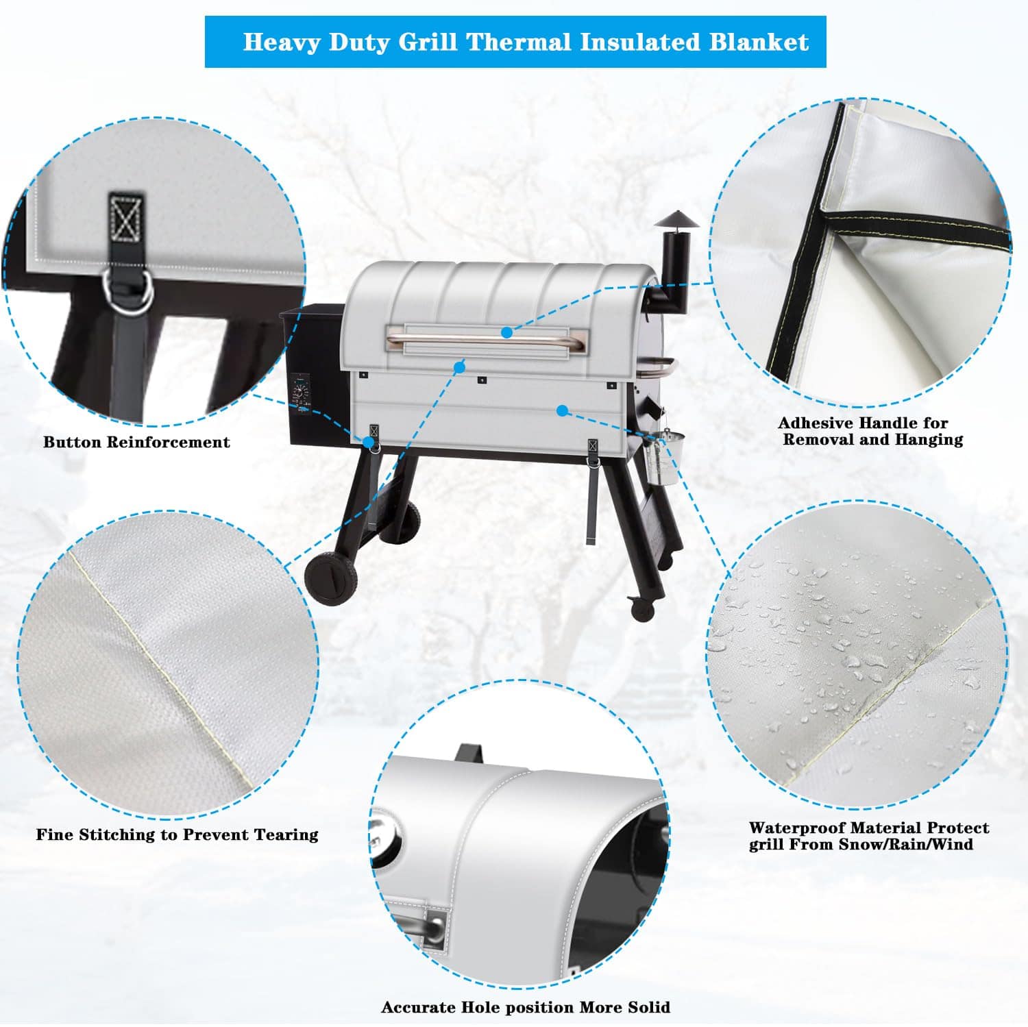 2. Material: El cobertor de aislamiento térmico está hecho de manta de fibra de vidrio ignífuga, resistente al calor. La superficie térmicamente aislada actúa como un amortiguador entre los elementos y la parrilla, reduciendo la cantidad de combustible quemado debido a las bajas temperaturas exteriores. ¡Alimenta tu parrilla sabiamente! Este cobertor de aislamiento térmico mantiene un calor constante en invierno, reduciendo el consumo de pellets de madera en un 25%-50% durante el ahumado y reduciendo los tiempos de cocción en al menos un 20%.