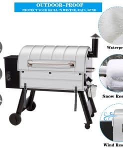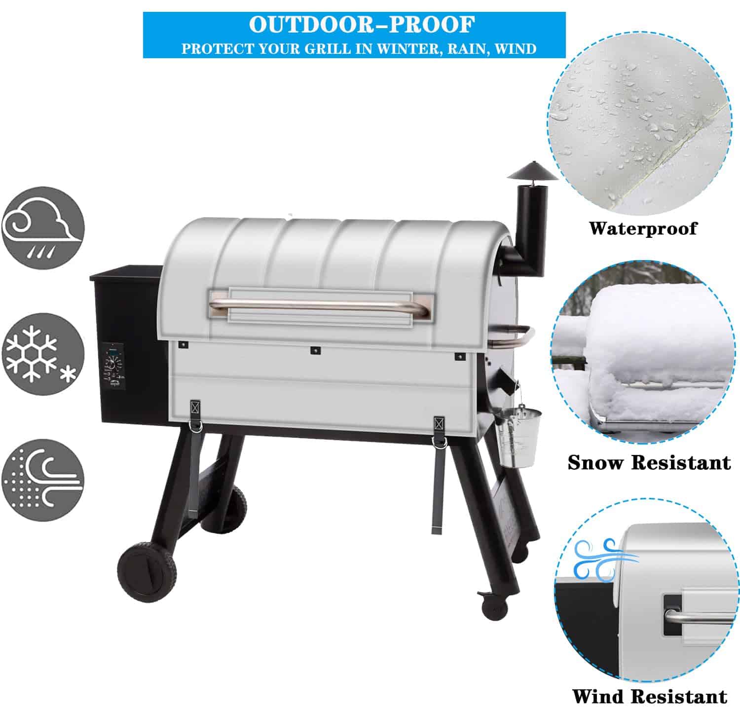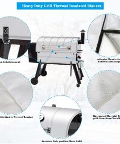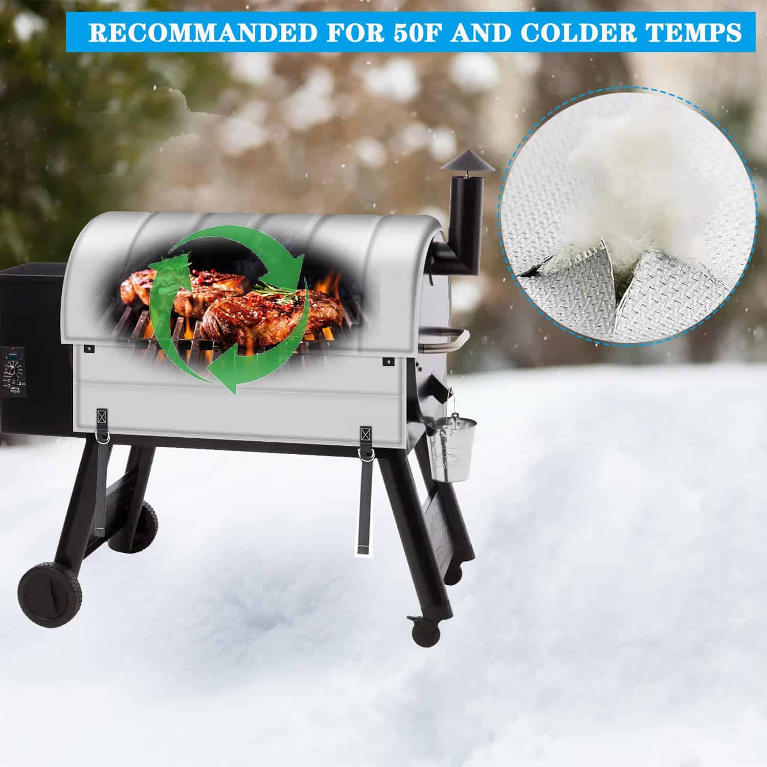 4. Reduce el consumo de pellets El cobertor térmico proporciona un cálido amortiguador y ayuda a proteger de elementos como la nieve y la lluvia mientras asas a la parrilla. El cobertor aislado ayuda a garantizar temperaturas consistentes en condiciones extremadamente frías. También garantiza que no desperdicies pellets cuando el clima se vuelve frío, para que tu parrilla funcione con máxima eficiencia.