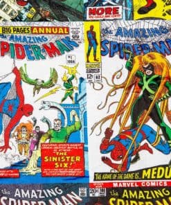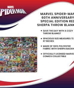 SALVA EL DÍA CON SPIDEYSpidey ha estado protegiendo el vecindario desde su debut en 1962. Ahora, el legendario trepamuros te está protegiendo del frío con esta exclusiva manta conmemorativa del 60 aniversario de Spider-Man. El álter ego de Peter Parker entra en acción en este elaborado collage de portadas clásicas de cómics de Marvel de las mayores aventuras del héroe. Reúne números icónicos de The Amazing Spider-Man, The Spectacular Spider-Man y otros títulos populares en un diseño heroico.NAPTIME CON TUS LANZARRED’S FAVORITOSPonte unas telarañas con esta manta de lana polar extragrande que rinde homenaje al trepamuros original. Cuando el agotamiento hace que tus sentidos de Spidey vibren, tómate un descanso de ser todo un superhéroe para disfrutar de un poco de «tiempo para mí.» Súper suave al tacto, el respaldo de sherpa rojo proporciona una capa adicional de calidez que la hace ideal para acurrucarse en el sofá o la cama mientras lees tus cómics favoritos. Envuélvete en las aventuras del trepamuros con este coleccionable oficial de Marvel Comics.UN TEMA DE PERSONAJE QUE TEJE TELARAÑASPresenta 60 números clásicos de la serie Spider-Man de Marvel Comics:Amazing Fantasy 15 (primera aparición de 1962)Marvel Team-Up 9 (1973 con Iron Man)The Amazing Spider-Man 316 (1989 con Venom)Spider-Man: Torment 1 (1990)The Spectacular Spider-Man 200 (número aniversario de 1993 de tamaño gigante)Y muchos, ¡muchos más!INSTRUCCIONES DE CUIDADOSe recomienda lavar a máquina con agua fría.
