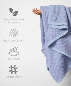 Descubre la versatilidad y el estilo de nuestra manta de tela de gofre, expertamente diseñada con algodón orgánico 100% en un clásico tejido de gofre para una suavidad y calidez incomparables. Ideal como una manta de sofá, manta de viaje, manta de picnic, o un acento de decoración boho, es perfecta para cualquier entorno, desde asientos al aire libre hasta una acogedora ropa de cama boho. Disfrútala como una manta refrescante en verano y una compañera acogedora en invierno, ofreciendo confort y encanto durante todo el año. Mejora tu ropa de cama con nuestras versátiles mantas arrojables, disponibles en una variedad de colores relajantes para combinar con cualquier ropa de cama boho. Elige entre cuatro tamaños convenientes: Individual, Queen y King, para encontrar el ajuste perfecto para tu cama. Ya sea que estés buscando una manta acogedora para el sofá, sillón o cama, o un elegante cobertor boho, nuestras mantas de tela de gofre ofrecen tanto comodidad como atractivo estético. Relájate con nuestra versátil manta de tela de algodón, diseñada para brindar comodidad y estilo donde sea que vayas. Perfecta para múltiples usos, esta acogedora manta se adapta fácilmente desde un elegante cobertor de sofá hasta un confiable compañero al aire libre, listo para cualquier aventura. Ya sea añadiendo un toque de lujo a tu suite principal, mejorando la decoración de la habitación de invitados, o sirviendo como una manta cómoda para tu sofá cama, esta manta brinda suprema comodidad y funcionalidad en cualquier escenario. Simplifica el mantenimiento con nuestra manta para cama que tiene instrucciones de cuidado directas. Lávala a máquina en frío en un ciclo suave, preservando su calidad lavada tras lavada. Para secarla, simplemente cuélgala plana para mantener su forma y suavidad, o sécala a baja temperatura si es necesario. Evita planchar y blanquear para que tu manta mantenga su aspecto y sensación óptimos durante años. Esto la convierte fácilmente en la decoración de una granja moderna perfecta y un imprescindible en tu colección de ropa de cama.