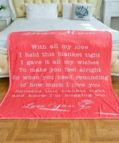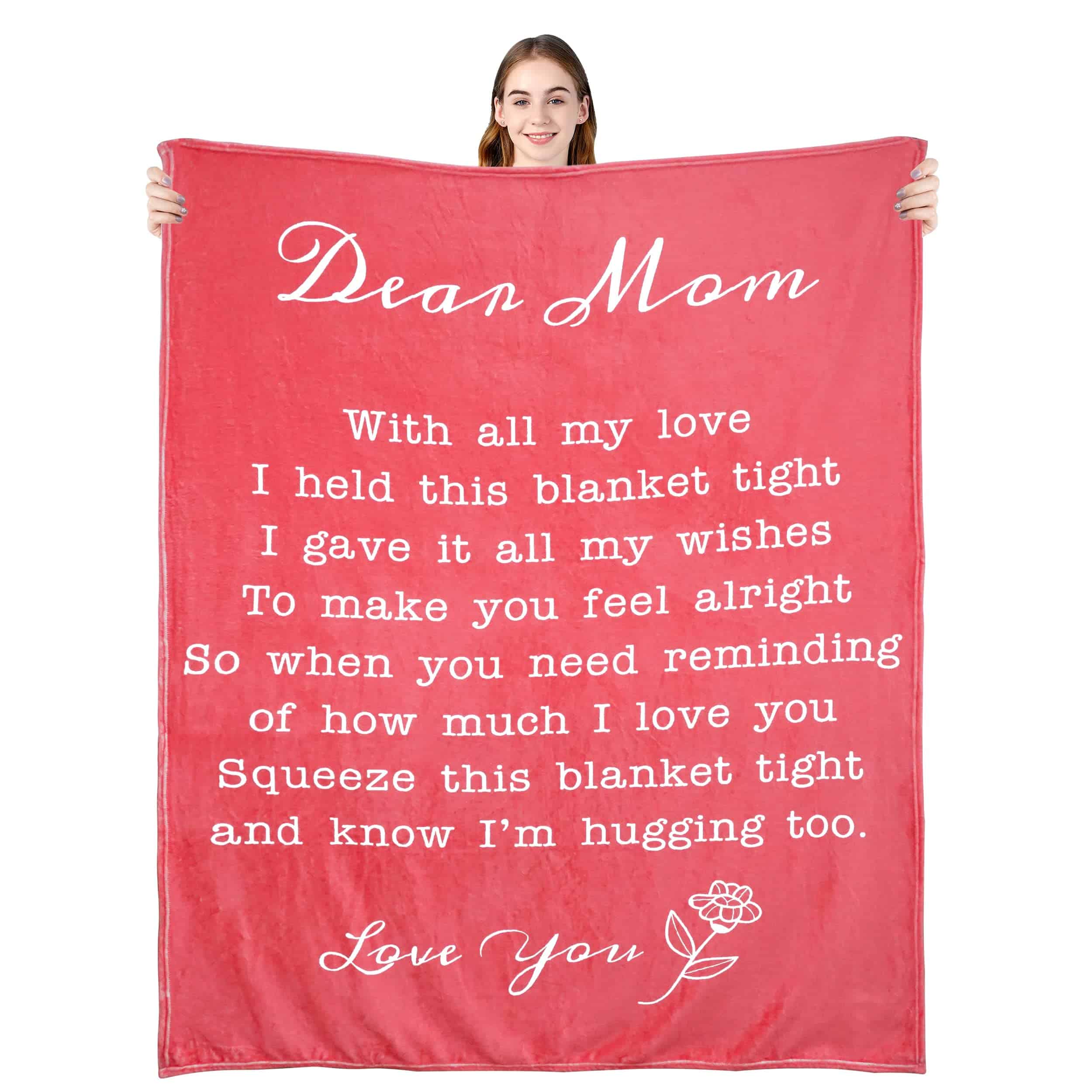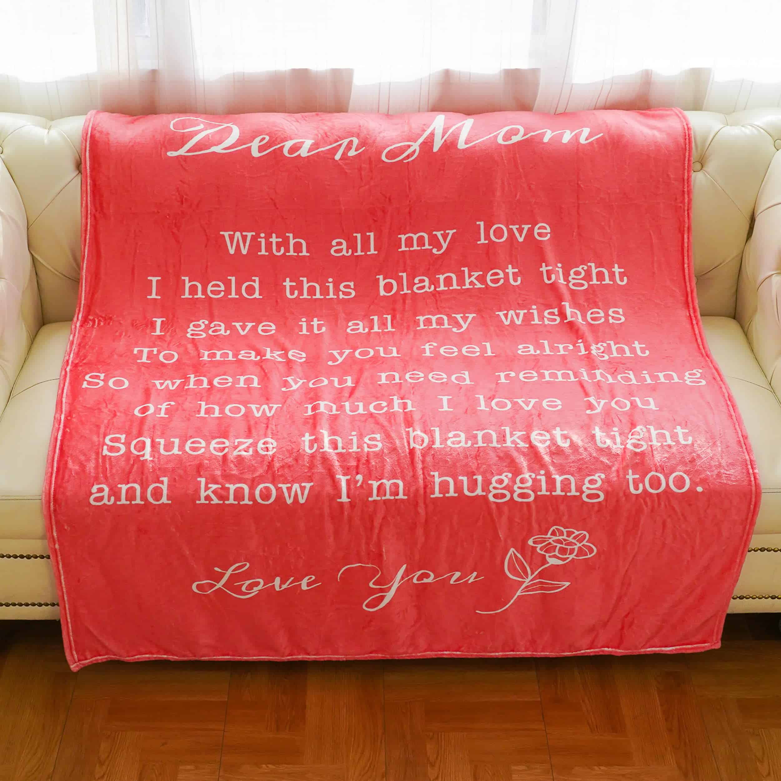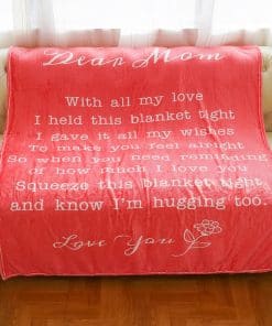 1. Cobija Personalizada: Grabada con el texto «cuando necesitas recordar cuánto te amo, aprieta esta cobija fuerte y sabrás que te estoy abrazando también» y tu mamá seguramente le encantará, hazla sentir cálida y amada.