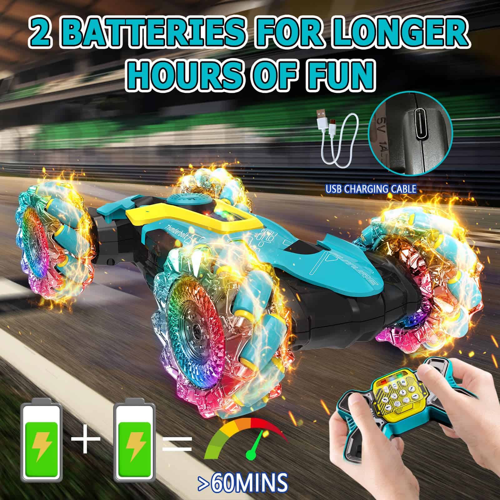 3. 2 Baterías para una Diversión Duradera: El coche de control remoto para niños de 8-12 años está equipado con dos baterías recargables para extender el tiempo de juego, y puedes cargarlo fácilmente en casa u otros lugares usando USB. Además, el control remoto usa dos pilas AA 1.5V (incluidas) y el control remoto por gestos utiliza cable de carga (incluido).