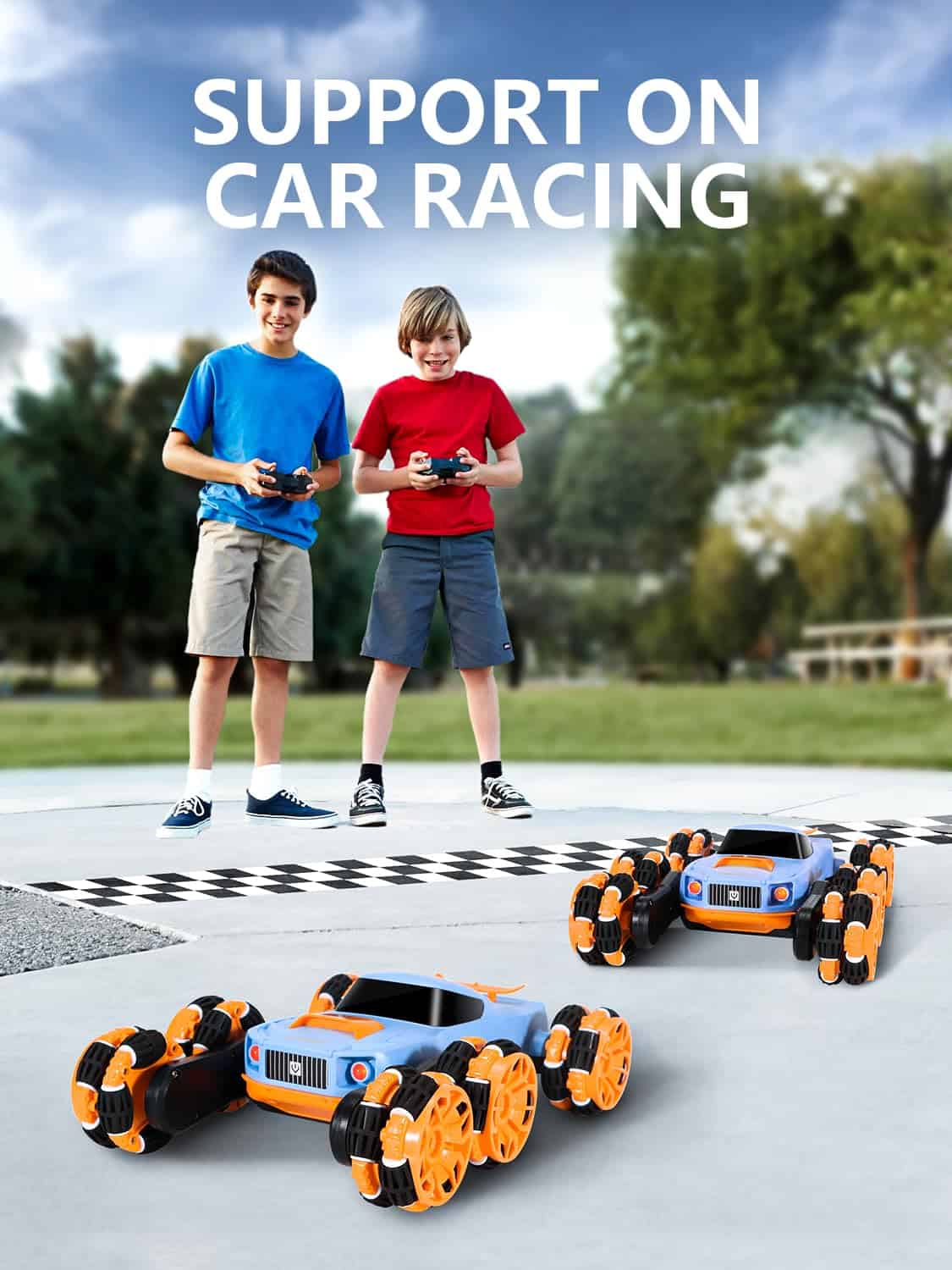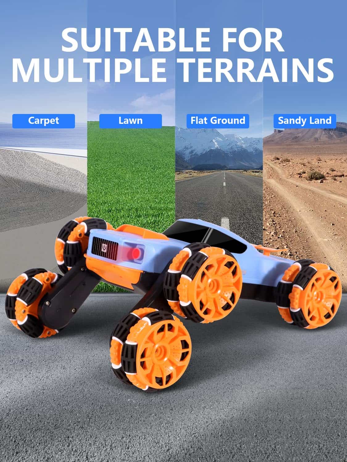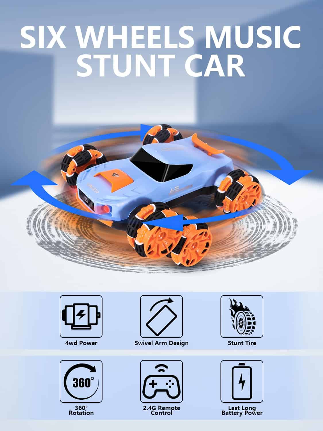 3. Escena de carrera realista: Este coche de acrobacias a control remoto está diseñado con música y demostración de un solo clic, lo que hará que los niños se sientan en una atmósfera de carrera real.