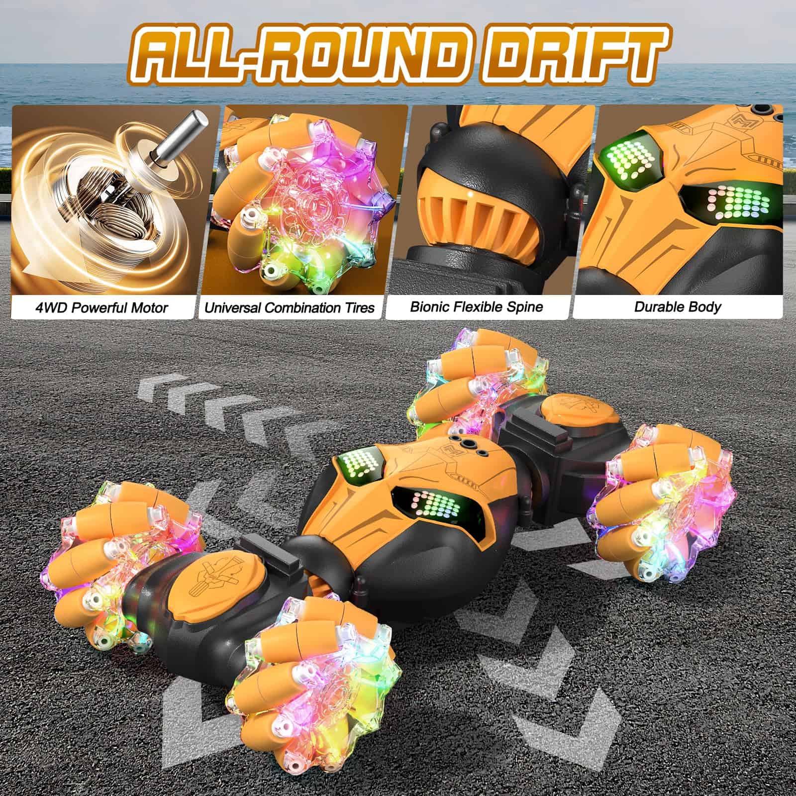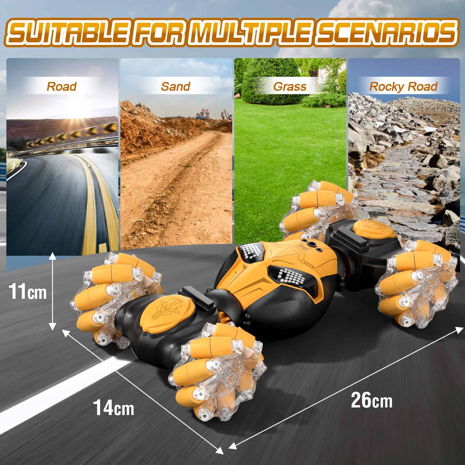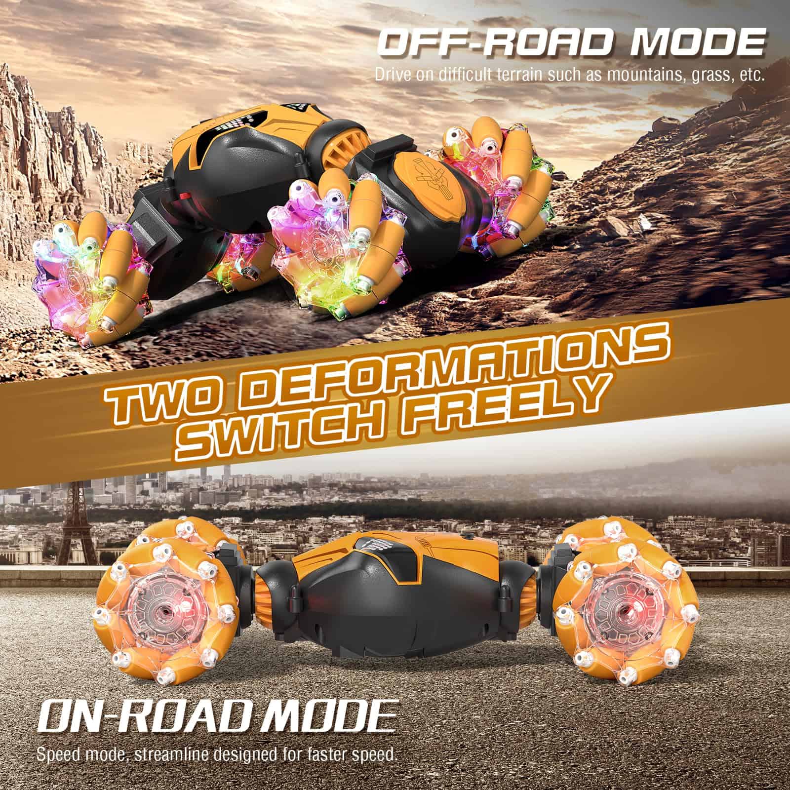 Coche de acrobacias Axirata con control de gestos. Coche monstruo transformador 4WD con motor potente que puede cambiar libremente entre el modo de velocidad y el modo todo terreno, con demostración automática, movimiento completo, derrapes laterales, rotación de 360 grados, ascenso de colinas en incrementos de 45 grados, giros en zigzag, deslizamiento lateral, etc., brindando a niños y niñas una experiencia de manejo sin precedentes y diversión infinita. Equipado con 2 baterías recargables para horas de diversión. Con efectos de iluminación y música impactantes, este coche de control remoto por gestos ofrece una experiencia de operación maravillosa y efectos visuales increíbles. Fabricado con plástico ABS duradero y materiales de alta calidad, resistente para la carretera. Diseñado para conquistar grava, césped, playa y otros terrenos, puede superar fácilmente varios obstáculos. Regalos geniales y divertidos para niños. Adecuado para uso tanto en interiores como en exteriores. Regalos ideales para niños y niñas de 6 a 12 años. ¡Es el regalo de cumpleaños perfecto, regalo del Día del Niño, regalo de Acción de Gracias, regalo de Halloween, regalo de Año Nuevo y regalo de Navidad para tu hijo!