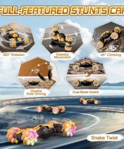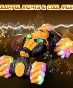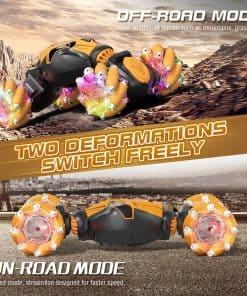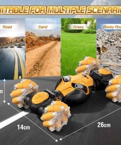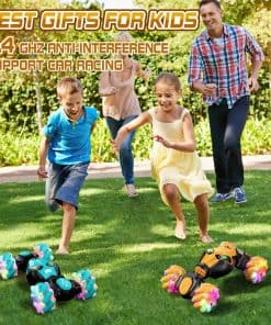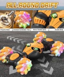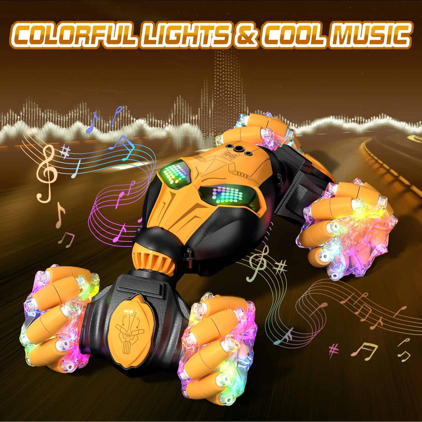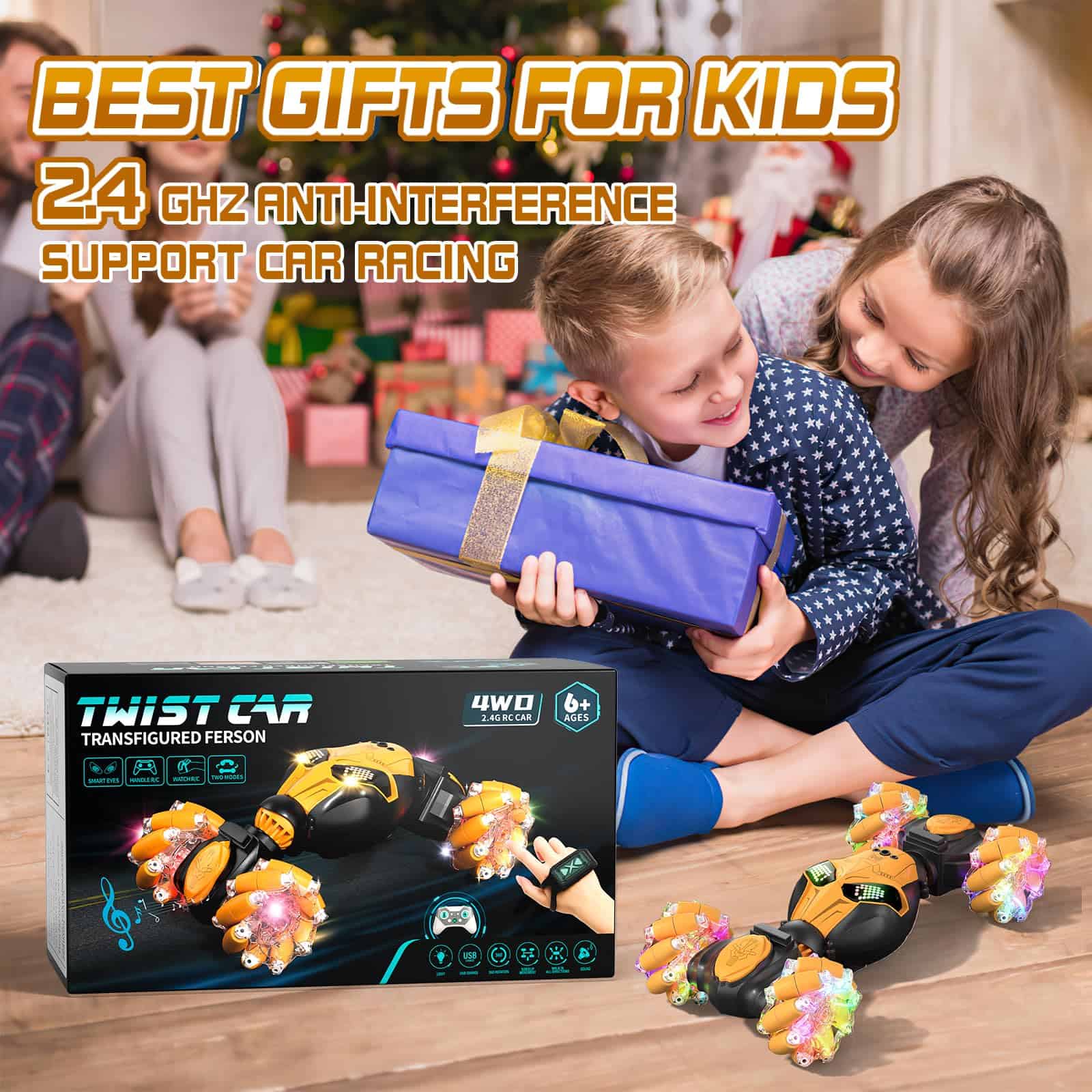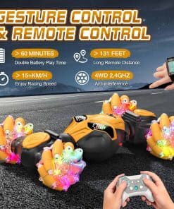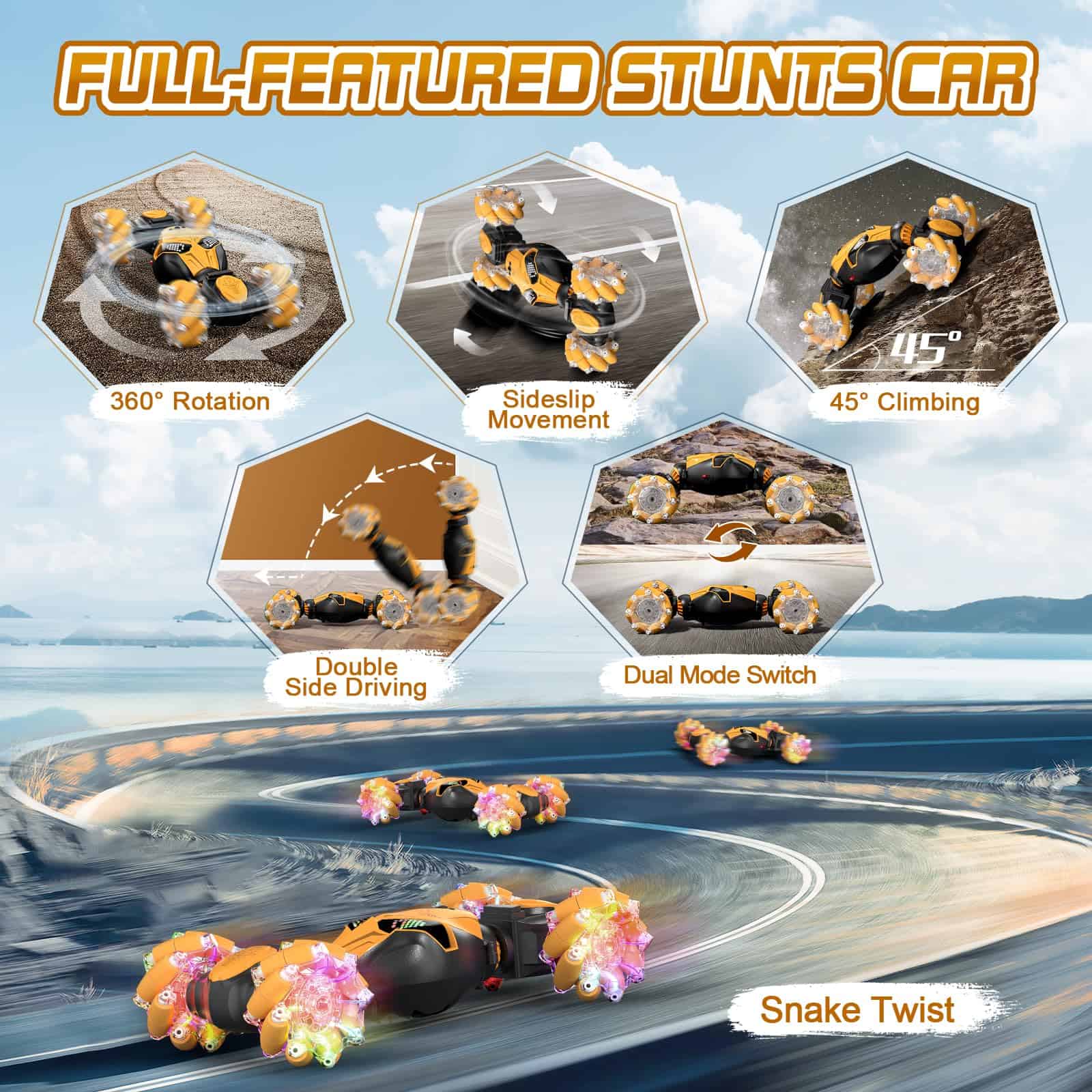 Coche de acrobacias Axirata con control de gestos. Coche monstruo transformador 4WD con motor potente que puede cambiar libremente entre el modo de velocidad y el modo todo terreno, con demostración automática, movimiento completo, derrapes laterales, rotación de 360 grados, ascenso de colinas en incrementos de 45 grados, giros en zigzag, deslizamiento lateral, etc., brindando a niños y niñas una experiencia de manejo sin precedentes y diversión infinita. Equipado con 2 baterías recargables para horas de diversión. Con efectos de iluminación y música impactantes, este coche de control remoto por gestos ofrece una experiencia de operación maravillosa y efectos visuales increíbles. Fabricado con plástico ABS duradero y materiales de alta calidad, resistente para la carretera. Diseñado para conquistar grava, césped, playa y otros terrenos, puede superar fácilmente varios obstáculos. Regalos geniales y divertidos para niños. Adecuado para uso tanto en interiores como en exteriores. Regalos ideales para niños y niñas de 6 a 12 años. ¡Es el regalo de cumpleaños perfecto, regalo del Día del Niño, regalo de Acción de Gracias, regalo de Halloween, regalo de Año Nuevo y regalo de Navidad para tu hijo!