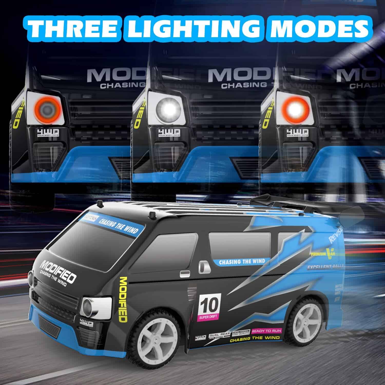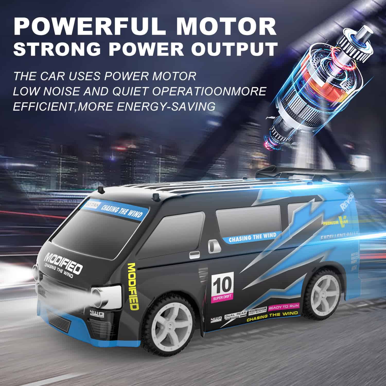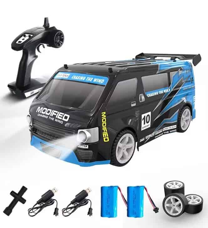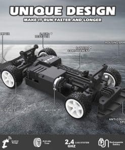 Coche de deriva RC de diseño moderno y estructura resistente. Carcasa de coche de PVC de alta calidad anti-choques con faros delanteros en forma de ángel, Tres modos de luz de colores para tus elecciones. Puede soportar el juego por la noche. También puedes apagarlo cuando no necesites las luces. Además de la resistente carcasa de coche de PVC, el coche RC cuenta con un chasis de nylon, duraderas ruedas de goma que te hacen sentir la experiencia realista de deriva. Batería recargable de alta calidad. El coche de control remoto está equipado con 2 baterías recargables de 7.4V / 800 mAh, cada batería puede ser utilizada continuamente durante aproximadamente 18 minutos, haciendo tu entretenimiento más duradero. y puedes cargar las baterías con el cable USB incluido en el paquete. Tecnología de 2.4GHz y Controlador de Pistola. Señal independiente y estable 2.4 GHz, soporta más de 10 jugadores jugando juntos sin interferencias. La distancia de control remoto alcanza los 50 metros, Motor de cepillo potente del coche RC con una velocidad máxima de 20 km/h, Es un regalo genial para niños y niños de nivel de aficionados que pueden desarrollar las habilidades de conducción e imaginación de los niños. REGALO DESEADO: Nuestros juguetes de coches de deriva RC son un regalo perfecto para fiestas o cumpleaños para niños y niñas de 6 años en adelante. Los niños disfrutarán del tiempo de carreras de deriva emocionante. Incluso el coche de control remoto también puede ser adecuado para adultos. Puede ayudar a relajarse después de una vida ocupada.