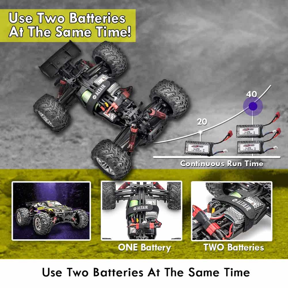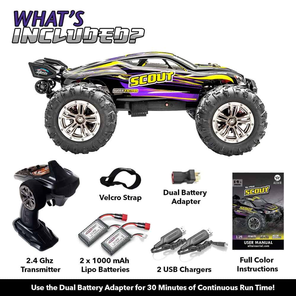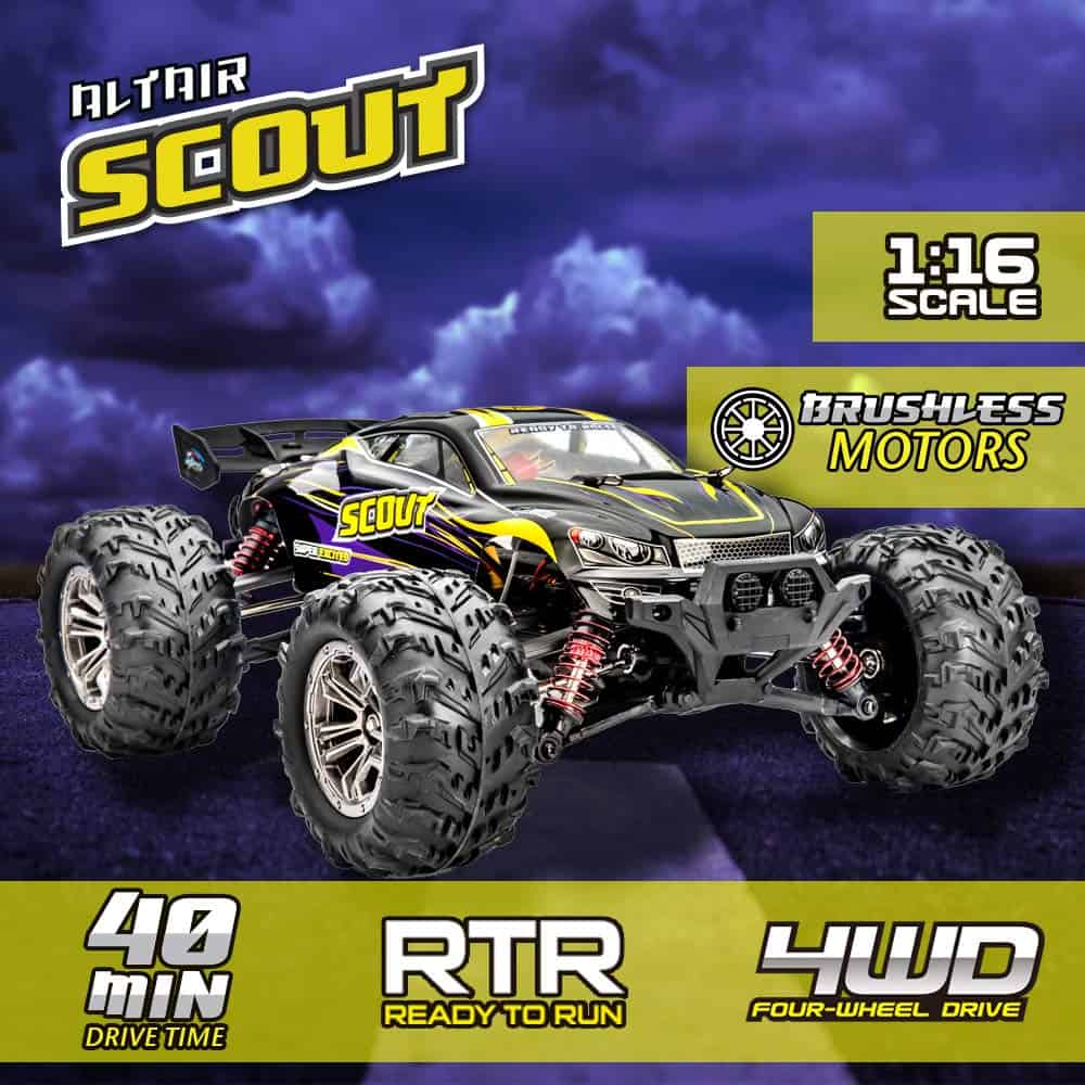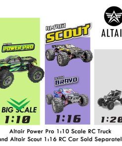 1. ¡El Altair Scout viene con dos baterías recargables de 7.4V 1000mAh Li-Po de alta capacidad que te darán hasta 20 minutos de tiempo de juego cada una! ¡Empareja las baterías junto con el adaptador de batería incluido, y obtendrás un increíble tiempo de funcionamiento de 40 minutos! 2. ¡El primer y único Coche RC Brushless de Altair! ¡El Altair Scout puede alcanzar velocidades de casi 35 MPH! ¿Quieres ir rápido? ¡Qué tal realmente rápido! Este coche de control remoto incluso cuenta con una Barra de Pulido para quemaduras rápidas adicionales! 3. ¡Los motores brushless del Altair Scout cuentan con tecnología avanzada que los hace extra rápidos y dominantes sobre la competencia! ¡Estos motores brushless durarán hasta tres veces más que los motores brushed mientras que solo utilizan el 33% de la potencia! ¡Menos consumo de energía significa más vida útil de la batería! 4. ¡El Altair Scout viene con un transmisor fácil de usar que incluye dos modos de velocidad diferentes! ¡Corre con el Scout con otros Coches y Camiones RC de la línea Altair sin interferencias! ¡Corre varios Coches y Camiones RC en una pista o en el patio trasero! ¡Es el regalo perfecto! 5. : Desde Lincoln, Nebraska, puedes confiar en nosotros para proporcionar soporte antes y después de la venta. ¡Somos el número 1 en servicio y soporte para Productos RC.