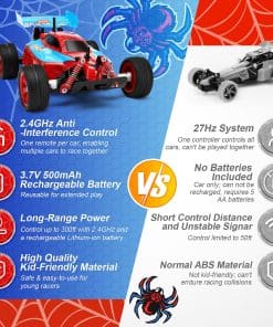 Coche de Control Remoto Araña NQD, Coches de Carreras RC de Alta Velocidad 2024 para Niños, Modelo de Coche de Hobby de Carreras de Araña 2.4Ghz con Control Remoto y Neumático de Deriva, Regalo de Cumpleaños para Niños de 3, 4-7, 8-12 Años. Prepárate para un emocionante paseo con los juguetes de araña 2024 para niños, donde el diseño genial se encuentra con la acción de alta velocidad! El coche de control remoto NQD presenta un aspecto atractivo inspirado en arañas que seguramente encenderá la imaginación de los jóvenes corredores. Construido para niños que ansían aventuras, su diseño futurista y genial lo hacen destacar en cualquier carrera, en interiores o exteriores. Prepárate para la diversión sin fin con un coche de araña de control remoto que no es solo un juguete, sino un espectáculo que cautivará a niños y adultos por igual. Experimenta la emoción de la carrera a alta velocidad con el coche RC de araña NQD, alimentado por un motor robusto que alcanza una velocidad máxima de 12 km/h. Ya sea que estés corriendo por el patio trasero o navegando en un recorrido interior, la impresionante velocidad y agilidad de este coche de deriva RC proporcionan horas de diversión emocionante y trepidante para los entusiastas de los coches RC de todas las edades. Obtén la ventaja en cada carrera con el control remoto avanzado de 2.4GHz de los coches de araña. Disfruta de una operación sin interferencias con un alcance de hasta 30 metros, perfecto para la acción multijugador. El manejo suave y preciso te permite navegar por curvas cerradas y acelerar con confianza para una experiencia de conducción ininterrumpida. La durabilidad se combina con la seguridad con nuestro coche de control remoto de araña para niños, construido con materiales ABS de alta calidad que son lo suficientemente resistentes para resistir golpes y choques. El diseño a prueba de golpes del coche de carreras de araña y los neumáticos de goma resistentes garantizan un uso duradero, convirtiéndolo en un compañero confiable para los momentos de juego aventureros de tu hijo, tanto en interiores como en exteriores. Buscando el regalo perfecto que combine diversión, emoción y durabilidad El coche de control remoto de araña para niños es la elección ideal para cumpleaños, festividades y ocasiones especiales. Sus capacidades de alta velocidad, diseño genial y características fáciles de usar lo convierten en la mejor opción para cualquier niño que ame los juguetes llenos de acción. Dale el regalo de la emoción y observa cómo su imaginación se dispara. En NQD, estamos comprometidos a proporcionar productos de alta calidad y un servicio excepcional para garantizar que tengas la mejor experiencia de compra. Si tienes alguna pregunta o inquietud sobre tu coche de juguete de araña, nuestro equipo de soporte está disponible las 24 horas del día, los 7 días de la semana para ayudarte. Ponte en contacto con nosotros en cualquier momento, y te responderemos de inmediato con una solución satisfactoria.