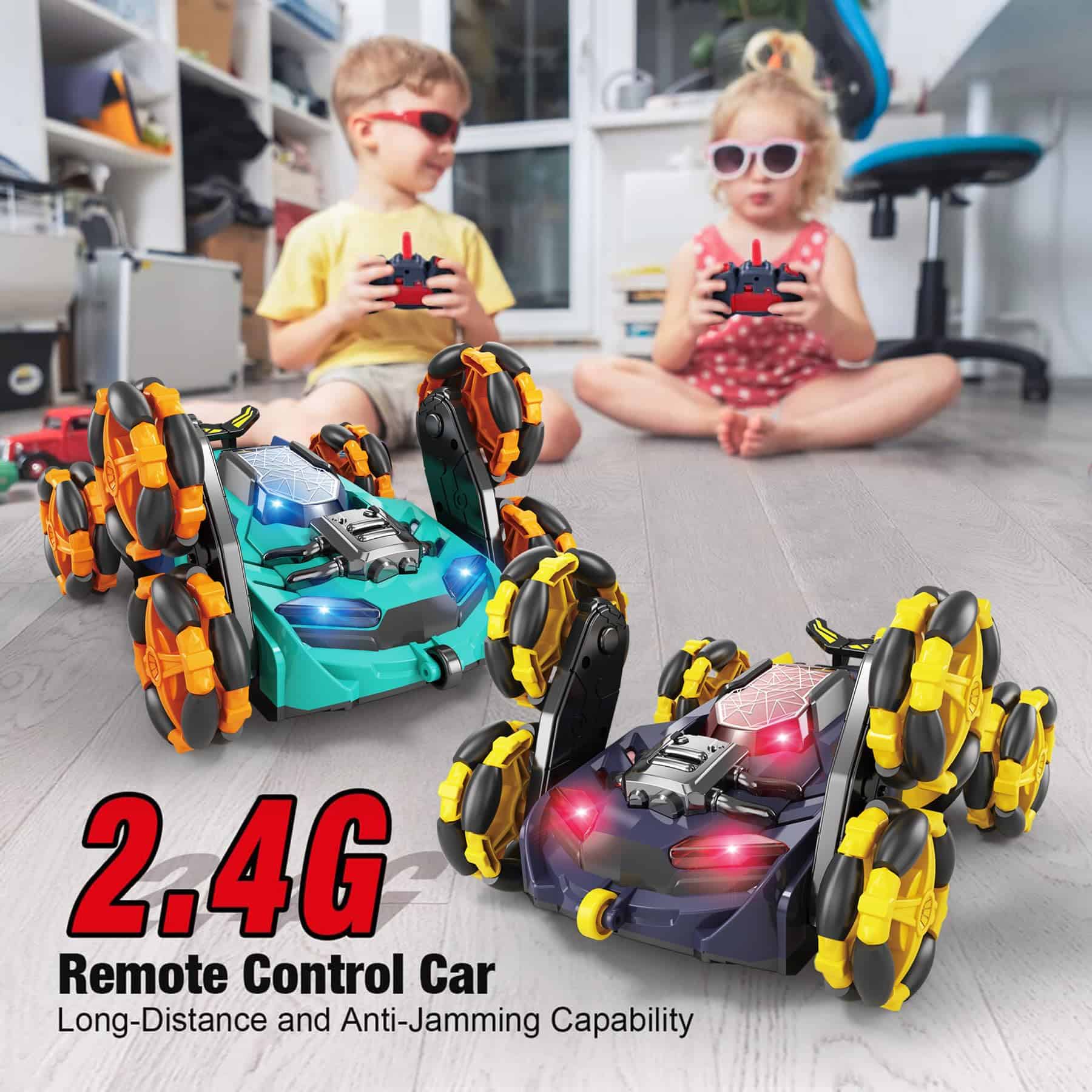 2. POTENTES COCHES RC: Los coches de control remoto rara vez se quedan atascados y mantienen entretenidos a los niños, evitando ser rescatados. Además, las luces y la música divertida ayudan a los niños a saber dónde están los coches de acrobacias en todo momento.